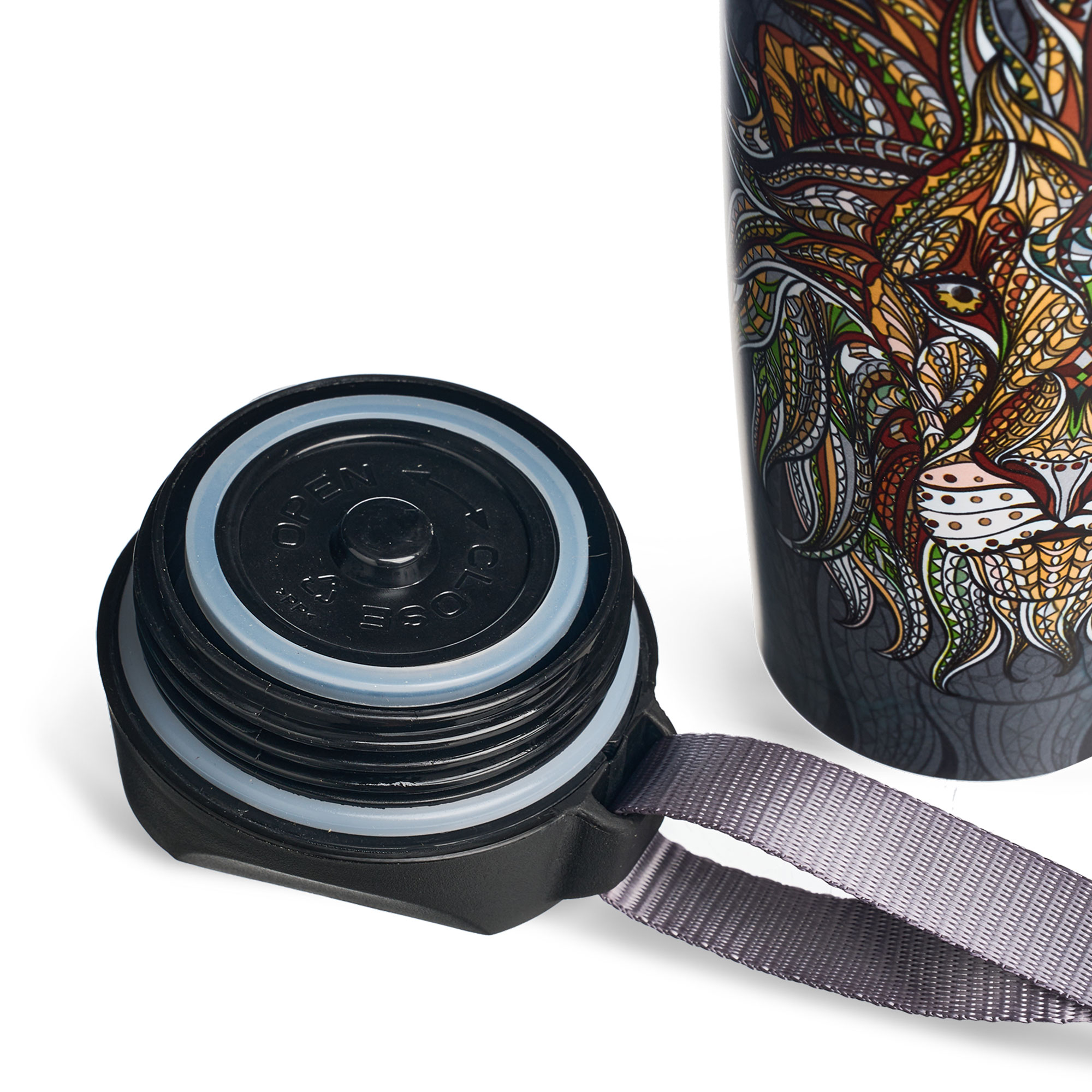ТЕРМОКРУЖКА AGNESS "ЛЕВ" С КНОПКОЙ-СТОППЕРОМ, 360МЛ КОЛБА НЕРЖ.СТАЛЬ 18/10