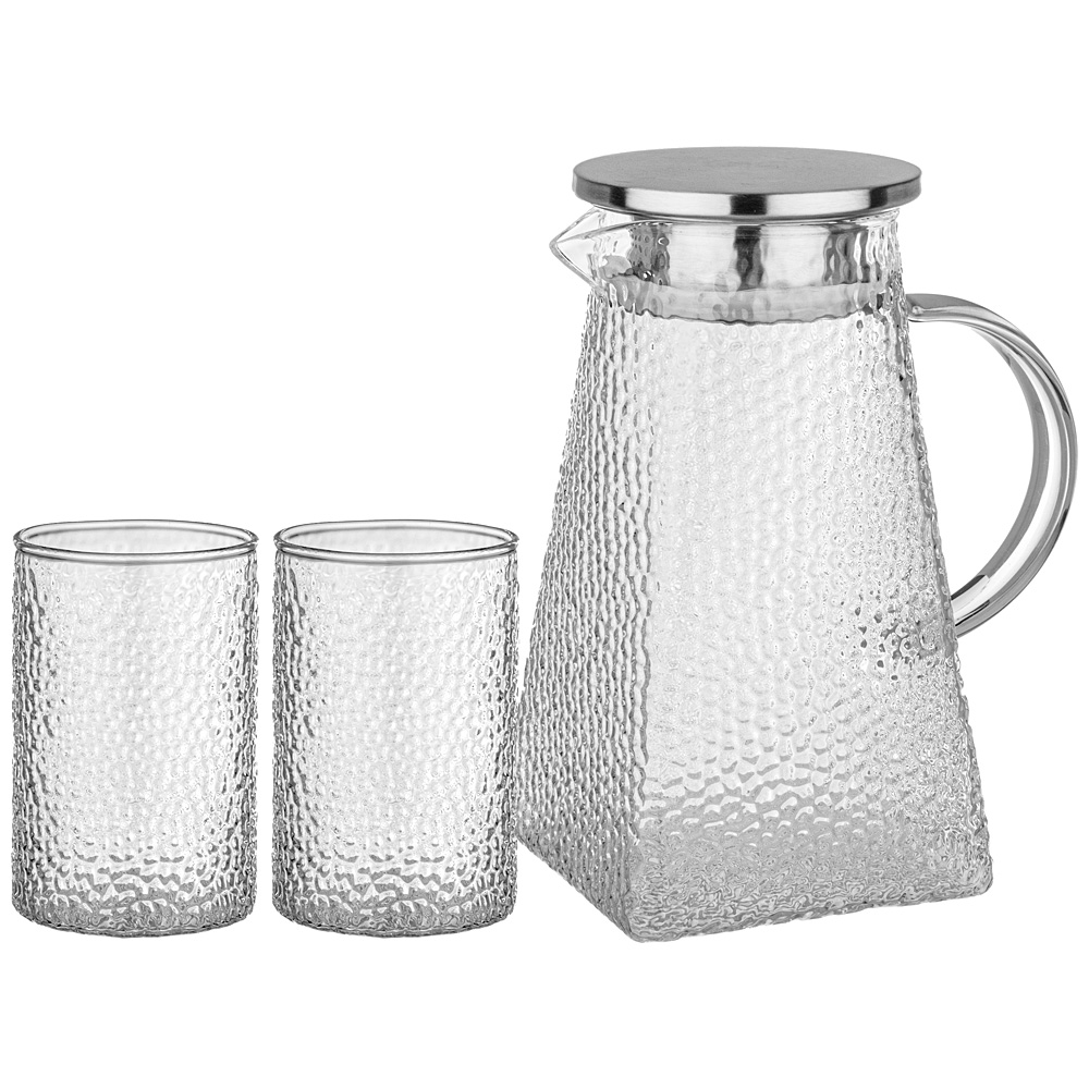 Данный набор выполнен из термостойкого жаропрочного стекла, которое выдерживает высокую температуру кипящей воды. В него входят кувшин и 2 стакана.