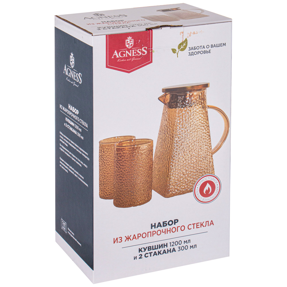 Данный набор выполнен из термостойкого жаропрочного стекла, которое выдерживает высокую температуру кипящей воды. В него входят кувшин и 2 стакана.