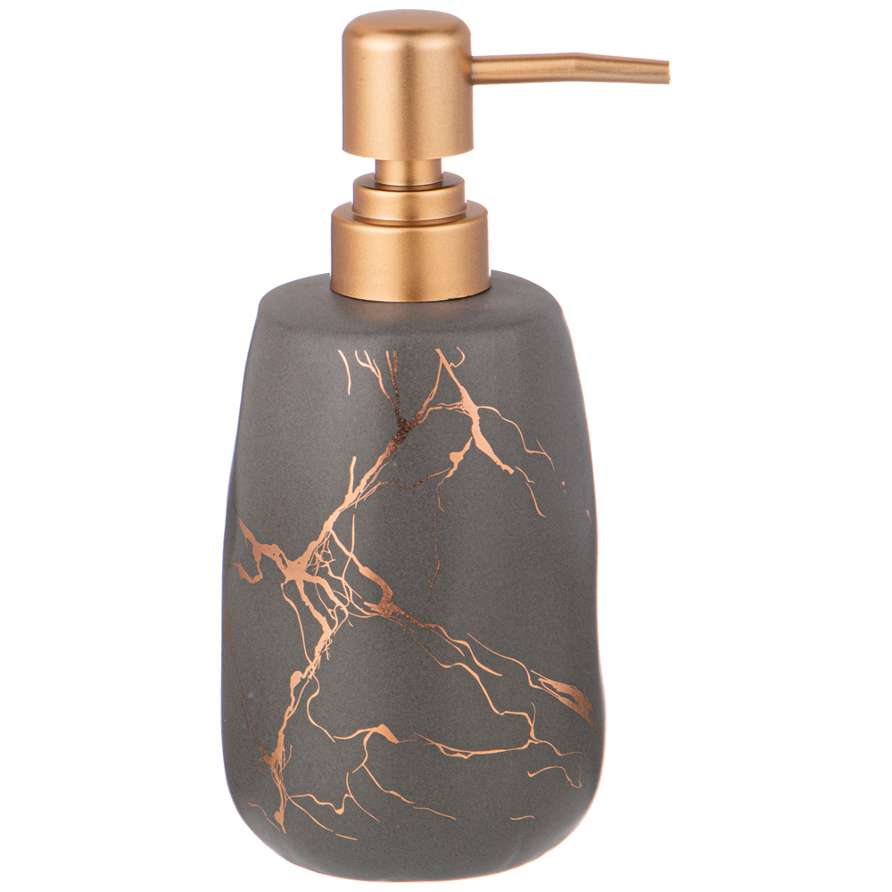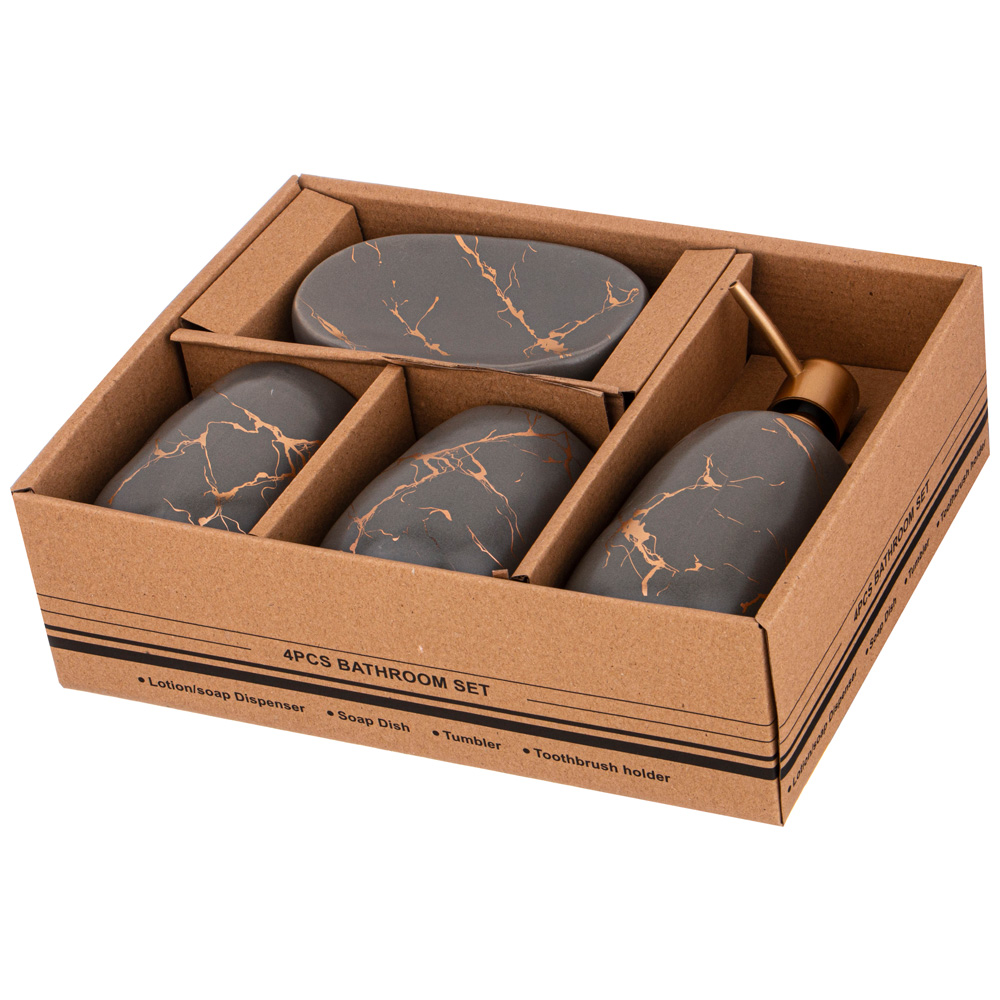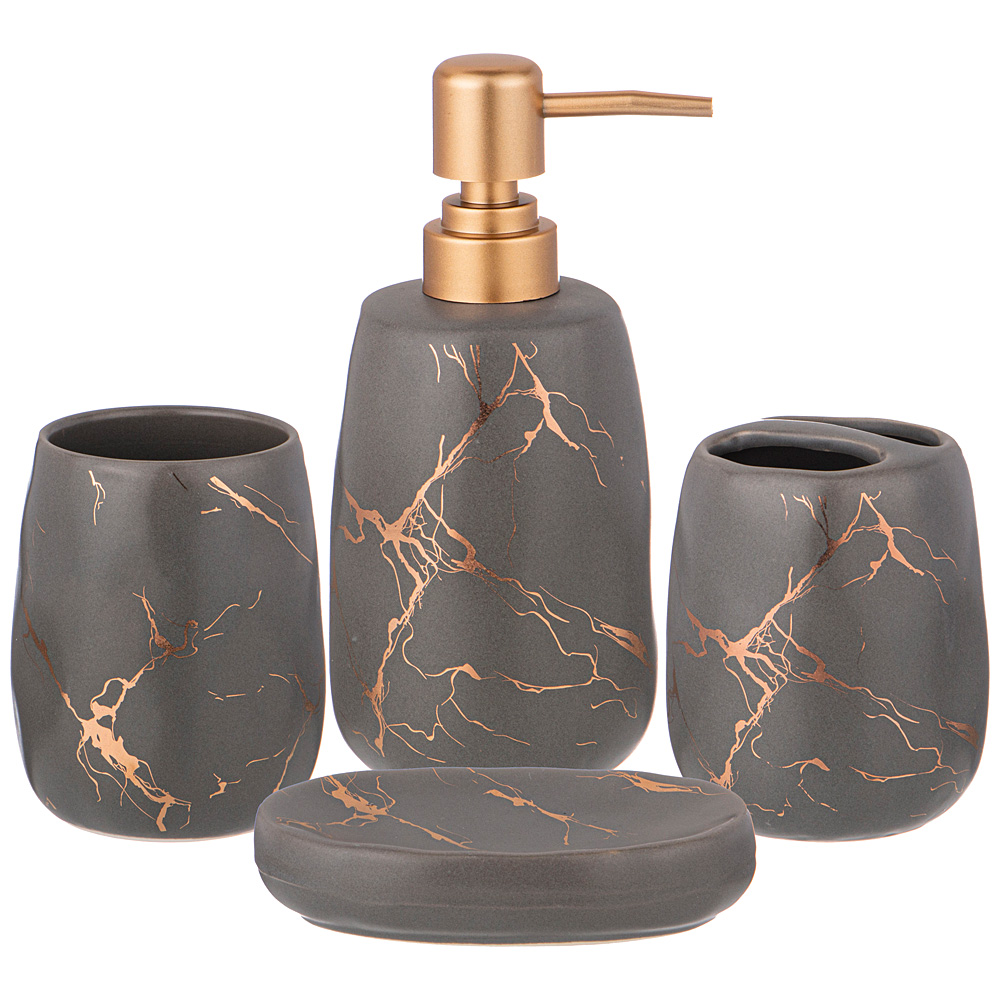 Набор аксессуаров для ванной комнаты состоит из дозатора для жидкого мыла, подставки-стакана, подставки для зубных щёток и мыльницы для кускового мыла.
