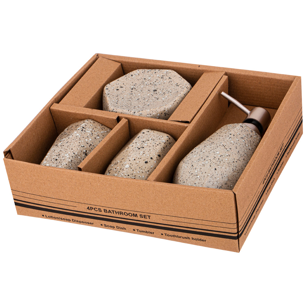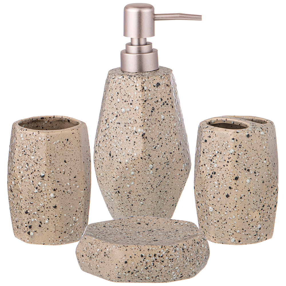 Набор аксессуаров для ванной комнаты состоит из дозатора для жидкого мыла, подставки-стакана, подставки для зубных щёток и мыльницы для кускового мыла.