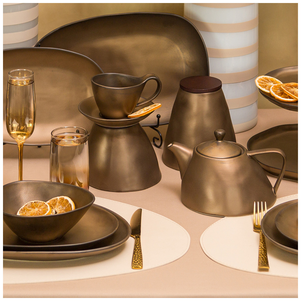 ТМ BRONCO коллекция BRONZE – это ультрамодная посуда из упрочненного фарфора для сервировки стола с элементами из темного бамбука. Для достижения эффекта состаренной античной бронзы используется матовая глазурь темного бронзового цвета. Смелое сочетание современных форм и матовой бронзы креативно и подчеркнет стиль и вкус хозяйки. Коллекция представлена обеденными и закусочными тарелками, салатниками и блюдами разных форм и размеров, посудой для чая и кофе, сервировочными наборами и подставками. Легко накрыть изысканный незабываемый стол. Продукция сертифицирована. Безопасна для контакта с пищевыми продуктами. Фарфоровые изделия можно использовать в микроволновой печи, мыть в посудомоечной машине с применением мягких неабразивных средств.