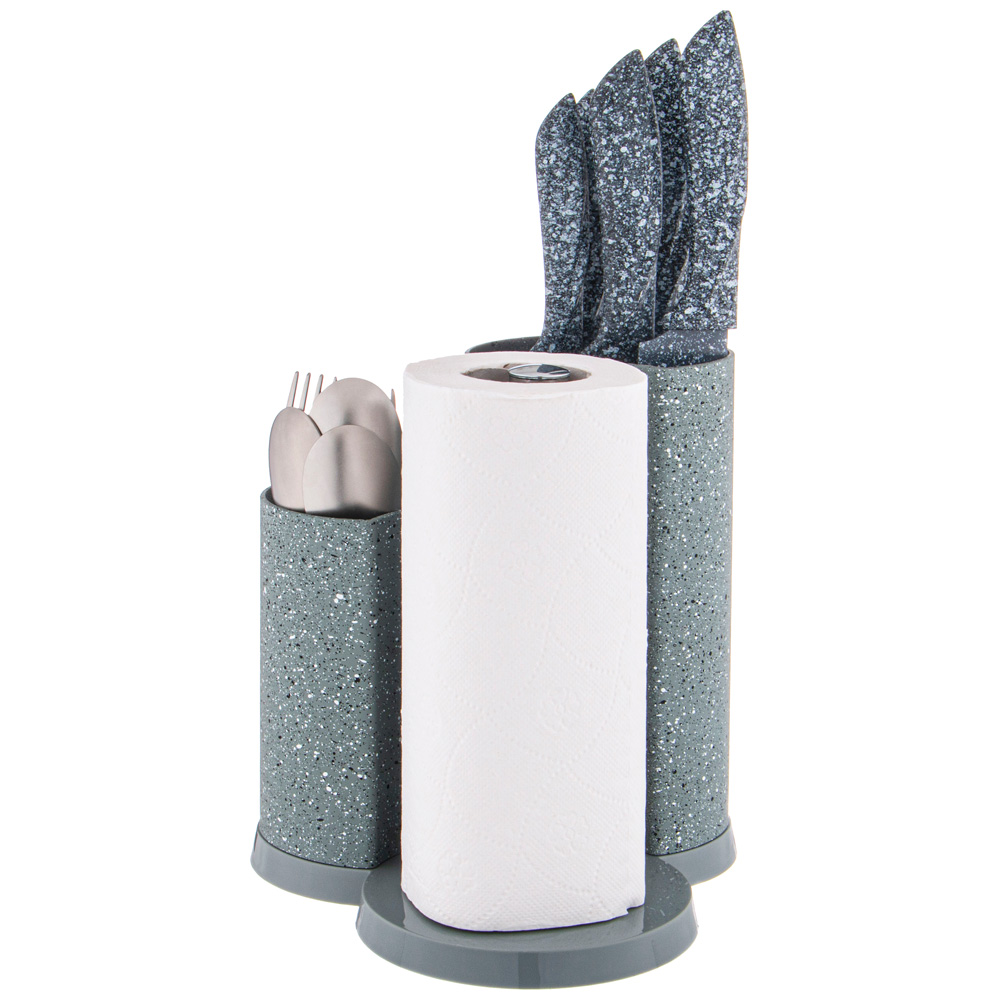 Подставка для ножей – необходимый аксессуар на каждой кухне. Подставка AGNESS с наполнителем и держателем для полотенец - это отличное решение для компактного хранения кухонных принадлежностей. Подставка легко и удобно решает проблему хранения ножей, защищая лезвия ножей от загрязнения. Дополнительный отсек можно использовать для хранения различных кухонных аксессуаров. Подставка для кухонных принадлежностей подходит для стандартных бумажных полотенец в рулонах.