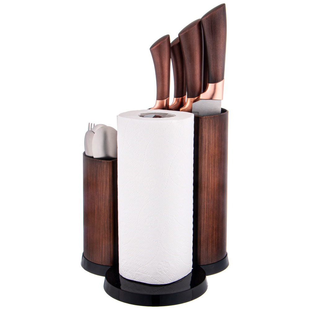 Подставка для ножей – необходимый аксессуар на каждой кухне. Подставка AGNESS с наполнителем и держателем для полотенец - это отличное решение для компактного хранения кухонных принадлежностей. Подставка легко и удобно решает проблему хранения ножей, защищая лезвия ножей от загрязнения. Дополнительный отсек можно использовать для хранения различных кухонных аксессуаров. Подставка для кухонных принадлежностей подходит для стандартных бумажных полотенец в рулонах.