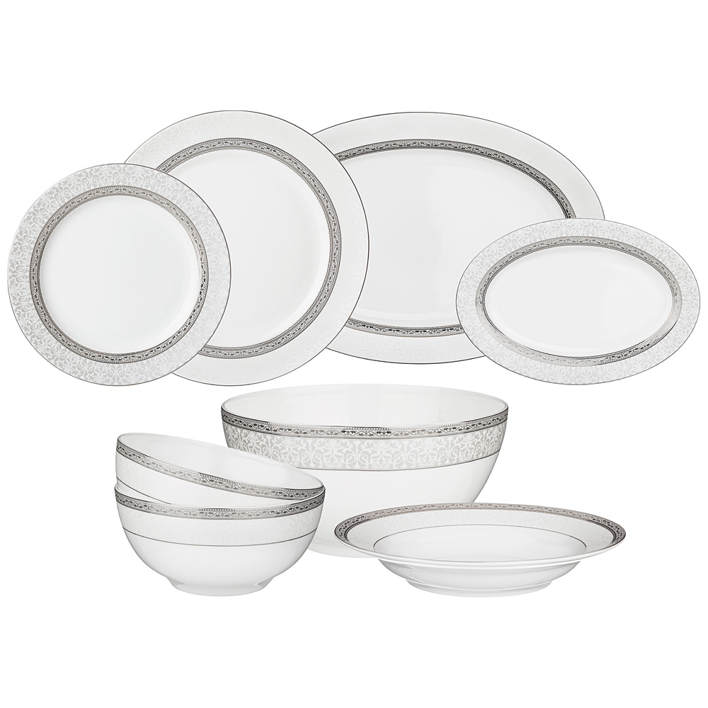 Комплектность: тарелка обеденная 25,5 см 6 шт., тарелка закусочная 20,5 см 6 шт., тарелка суповая 23 см 6 шт., салатник 23 см 1750 мл, салатник 16 см 750 мл 2 шт., блюдо овальное 36 см. блюдо овальное 23 см.