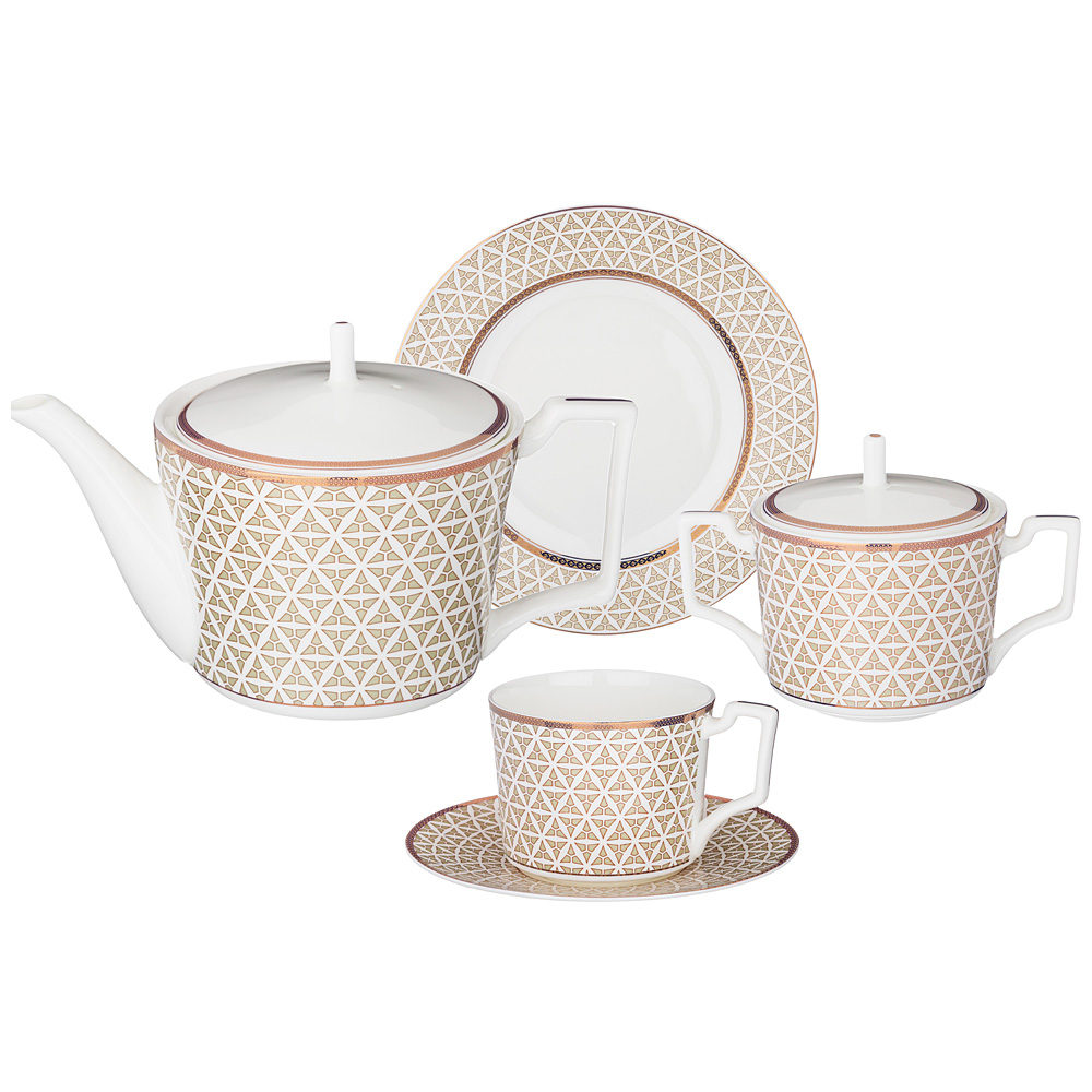 Комплектность: чайник 1000 мл - 1 шт., сахарница 300 мл - 1 шт., чашка 250 мл - 6 шт., блюдце 15,5 см - 6 шт., тарелка пирожковая 18 см - 6 шт..