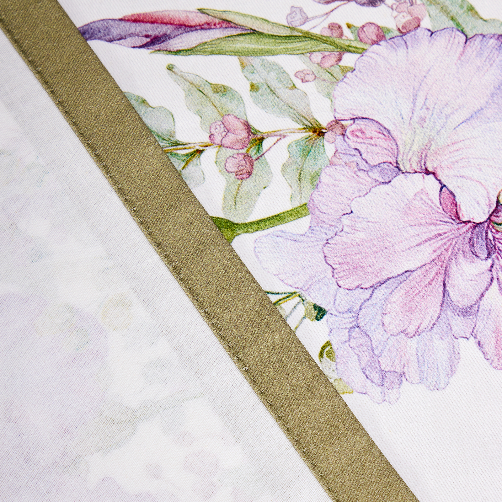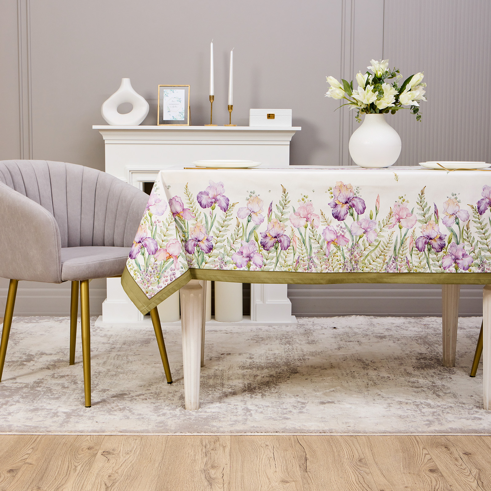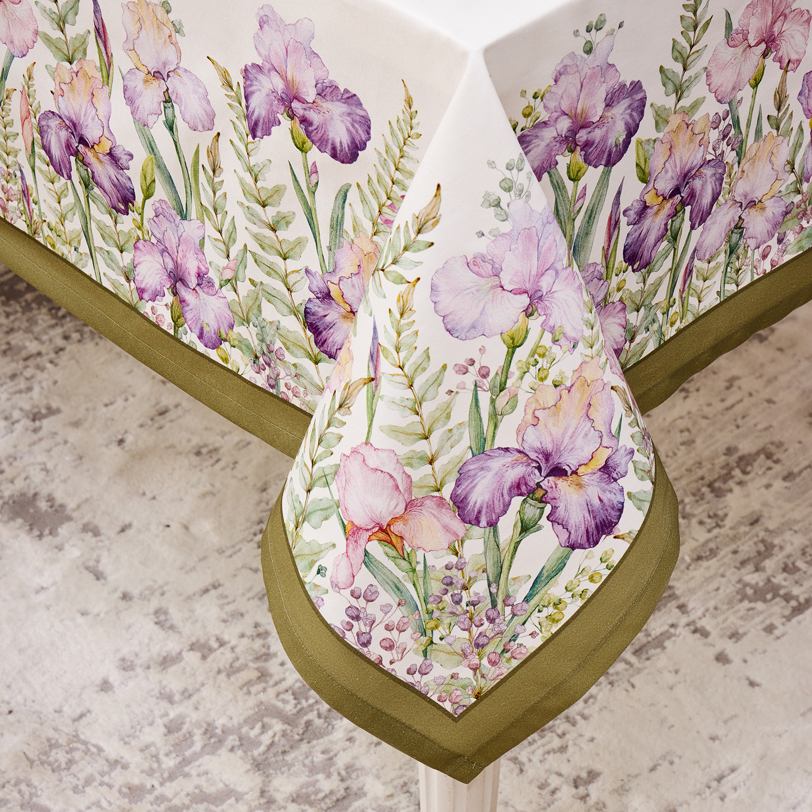 Рисунок с фиолетовыми ирисами нанесён методом цифровой печати по периметру — он остаётся ярким и чётким надолго. Кайма с зелёным кантом подчёркивает композицию и завершает образ.