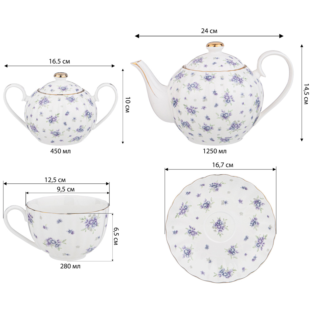 ТМ LEFARD коллекция "Sonnet in Blue" выполнена из тонкостенного упрочненного фарфора. Стильная форма, вместительный объем, модная синяя цветовая гамма, нежные цветочные букетики, отделка золотом - все это делает коллекцию неотразимой и очень привлекательной. Форма и цвет посуды способны оказать магическое действие на всех, кто находится за столом. В произведениях искусства синий — это цвет ночи и тени, а значит, идеальный цвет для тайны. Это прекрасный подарок, символизирует спокойствие и безмятежность. Нельзя ставить в микроволновую печь, не рекомендуется мыть в посудомоечной машине. Комплектность: чайник 1200 мл - 1 шт., сахарница 400 мл - 1 шт., чашка 280 мл - 6 шт., блюдце 17 см - 6 шт.