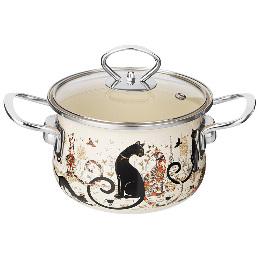 КАСТРЮЛЯ ЭМАЛИРОВАННАЯ AGNESS СО СТЕКЛЯННОЙ КРЫШКОЙ СЕРИЯ "ПАРИЖСКИЕ КОТЫ", 1.5 Л, 16*10 СМ