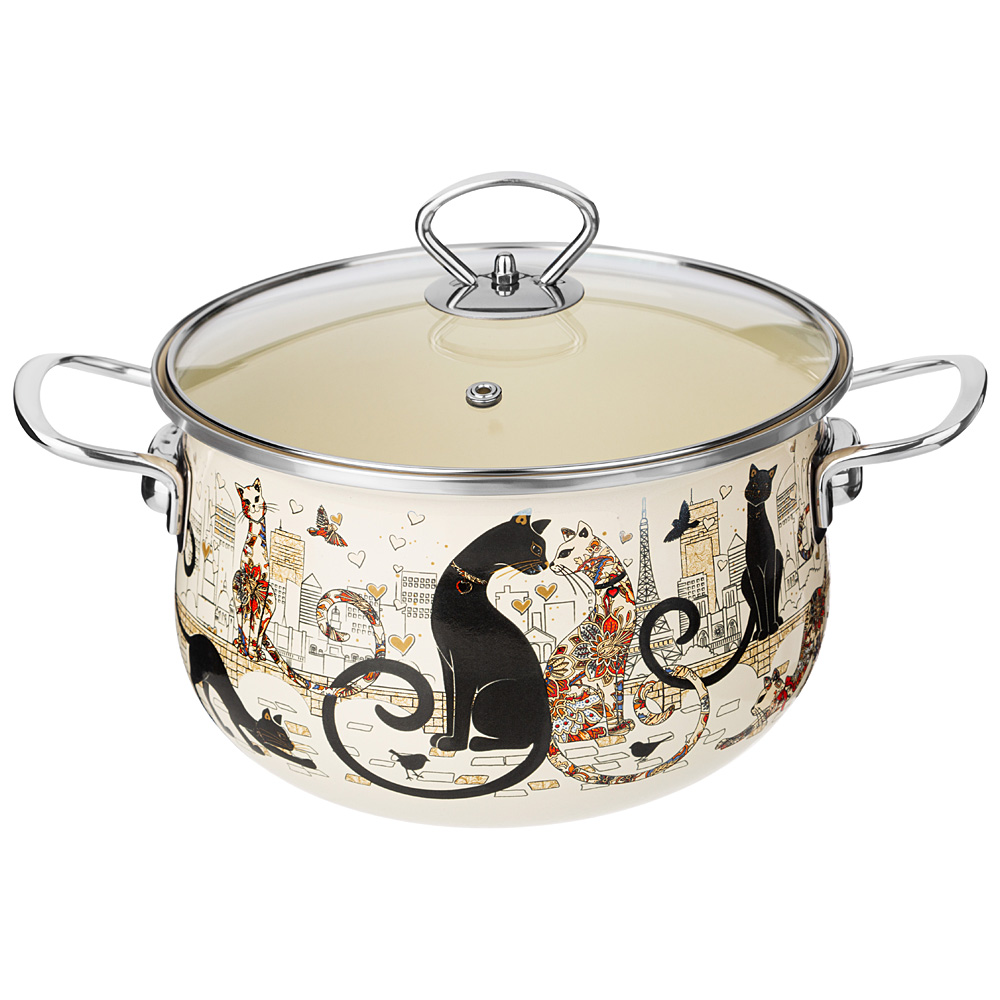 КАСТРЮЛЯ ЭМАЛИРОВАННАЯ AGNESS СО СТЕКЛЯННОЙ КРЫШКОЙ СЕРИЯ "ПАРИЖСКИЕ КОТЫ", 3.6 Л, 22*13 СМ