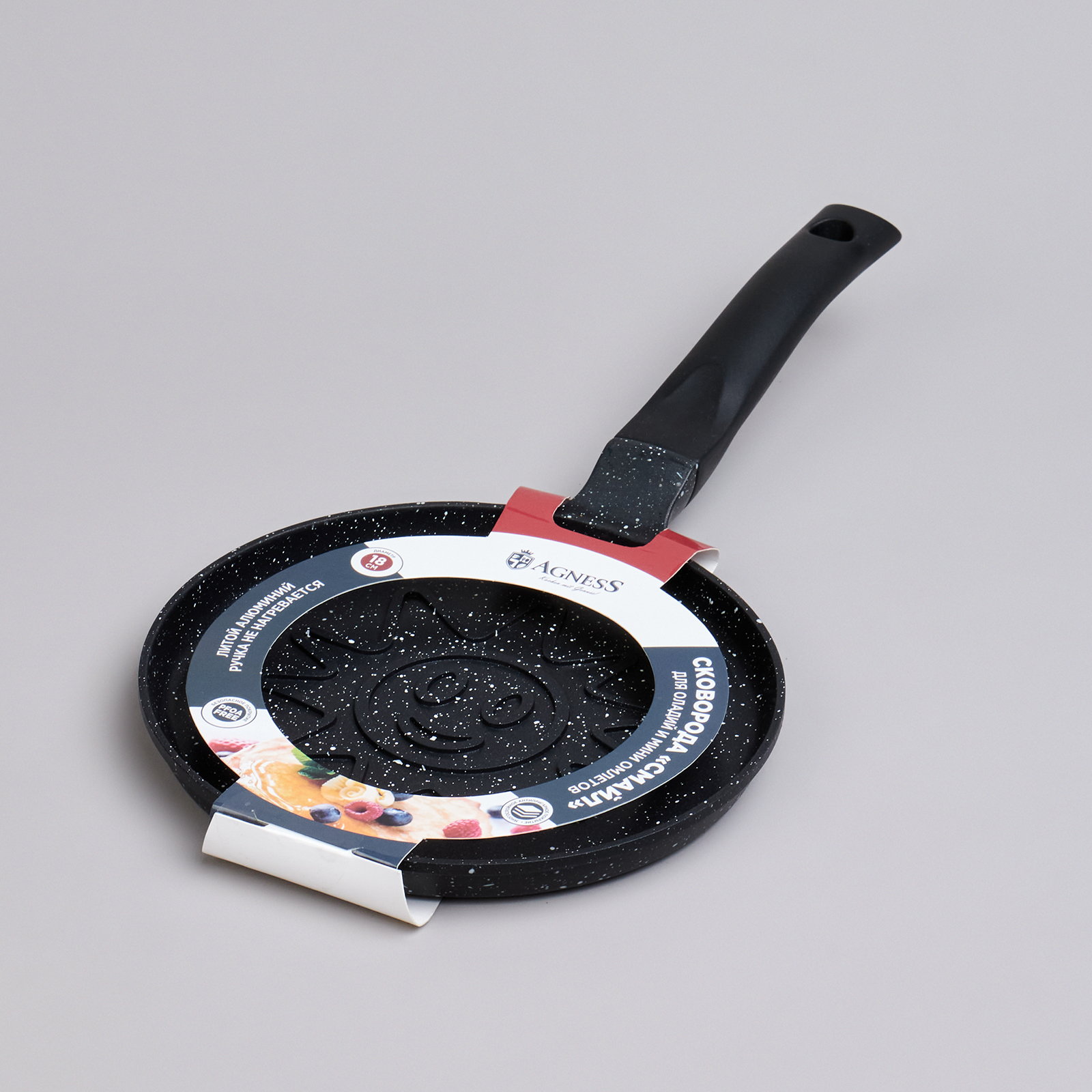 Сковороды AGNESS серии "СМАЙЛ" выполнены из литого алюминия. Такая посуда отличается высокой теплопроводностью и устойчивостью к деформациям. Необычный дизайн сковороды позволит приготовить интересные и веселые оладушки и омлеты.