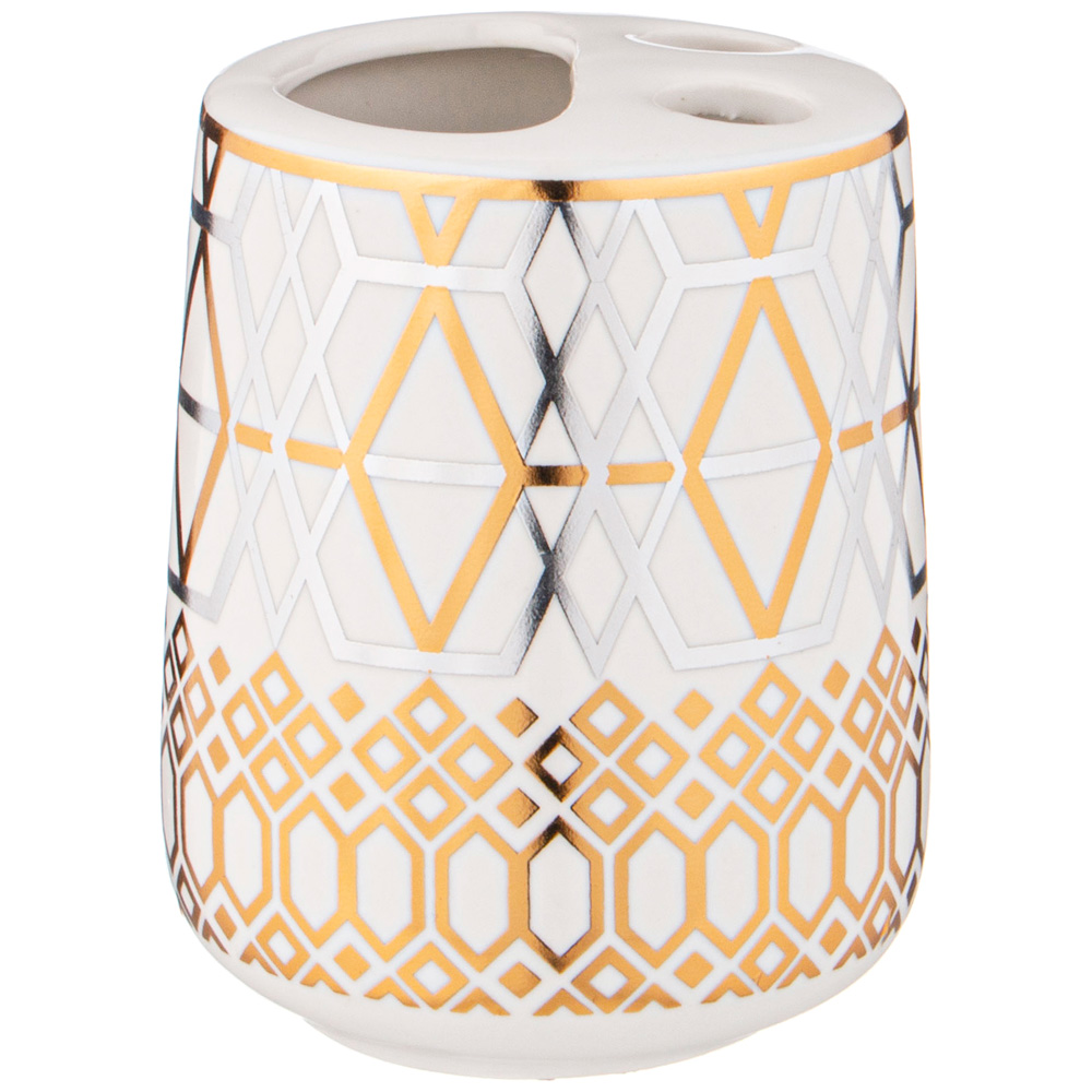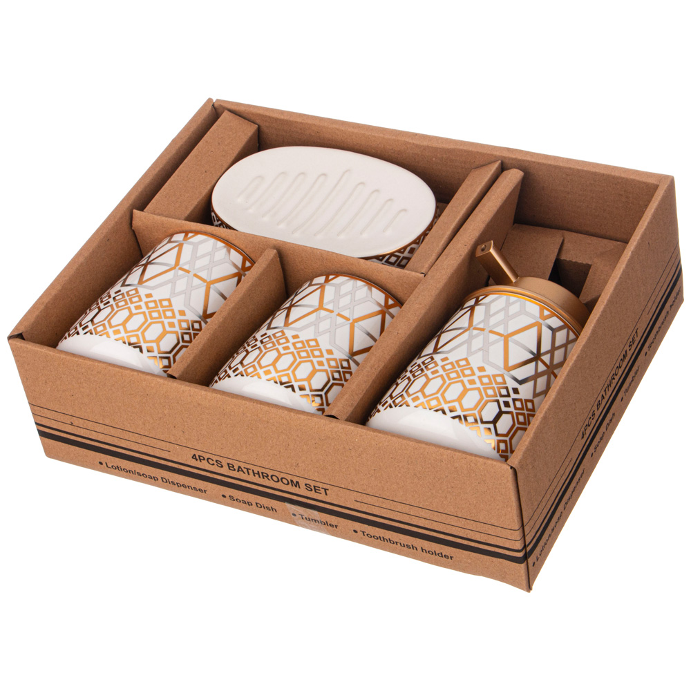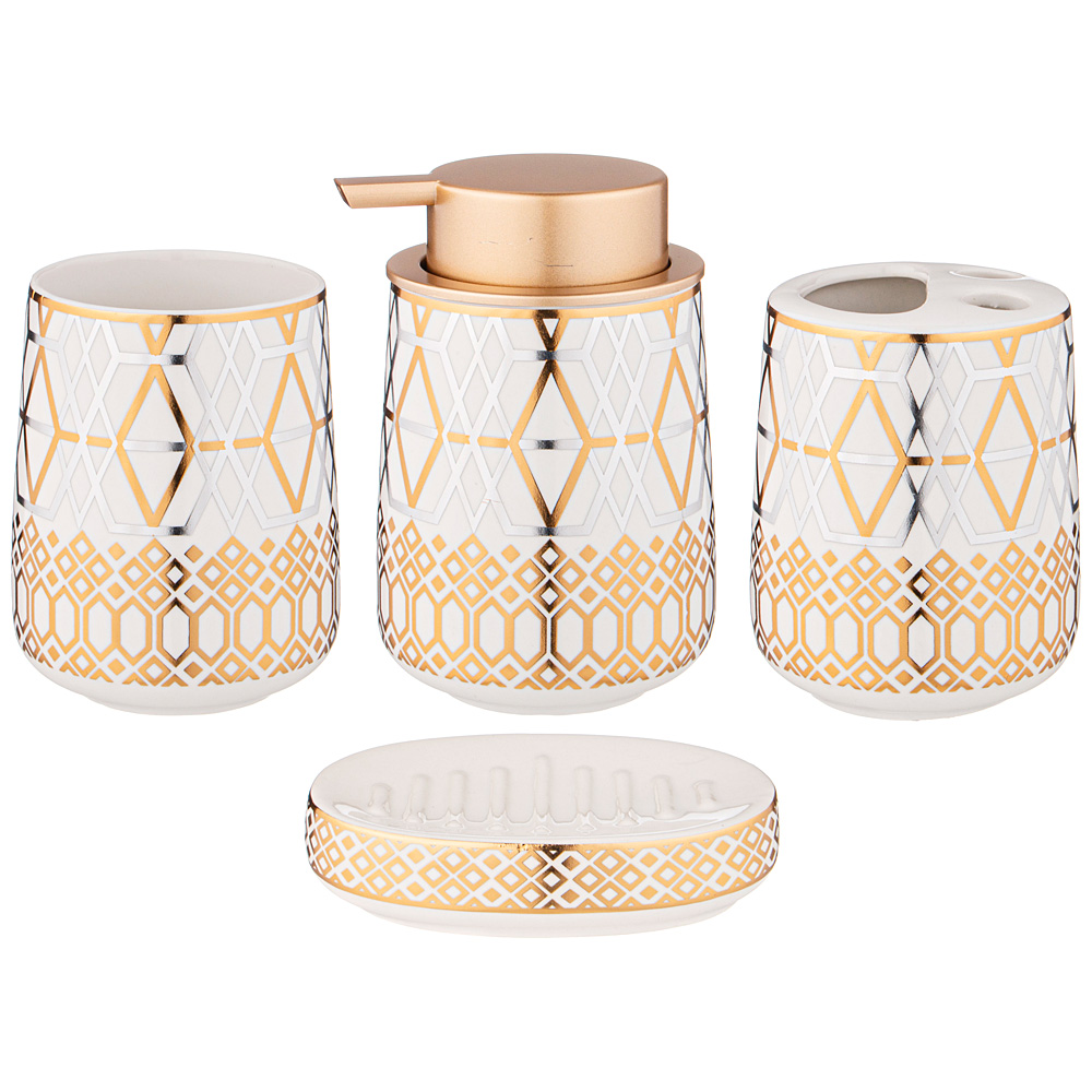 Набор аксессуаров для ванной комнаты состоит из дозатора для жидкого мыла, подставки-стакана, подставки для зубных щёток и мыльницы для кускового мыла.