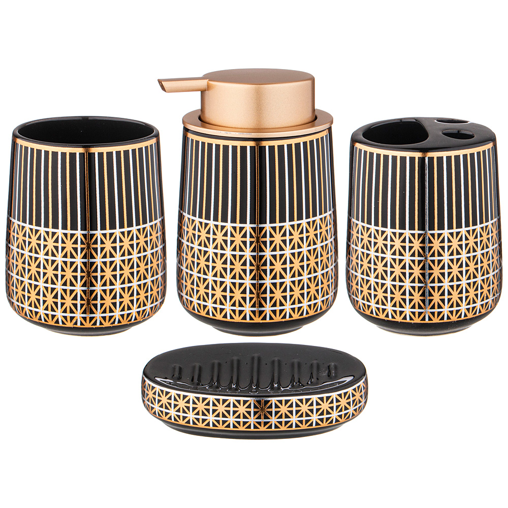 Набор аксессуаров для ванной комнаты состоит из дозатора для жидкого мыла, подставки-стакана, подставки для зубных щёток и мыльницы для кускового мыла.