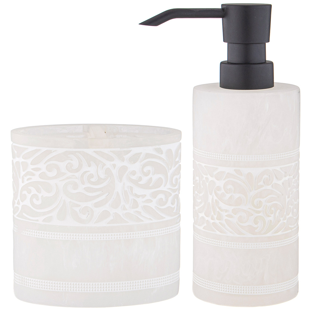 Набор аксессуаров для ванной комнаты состоит из дозатора для жидкого мыла и подставки-стакана.