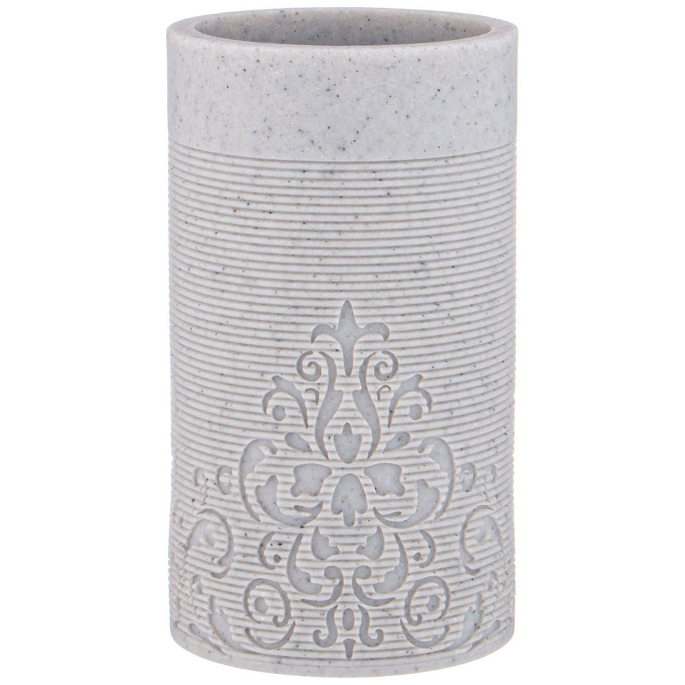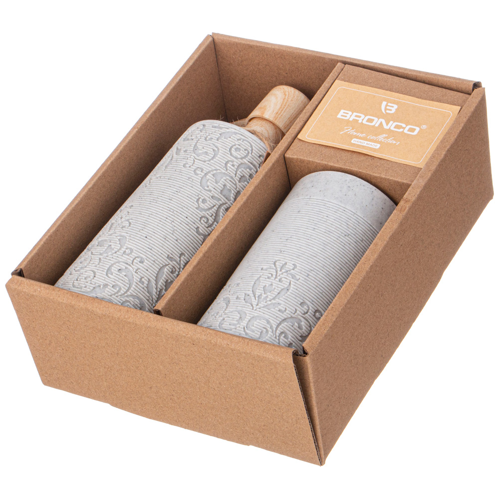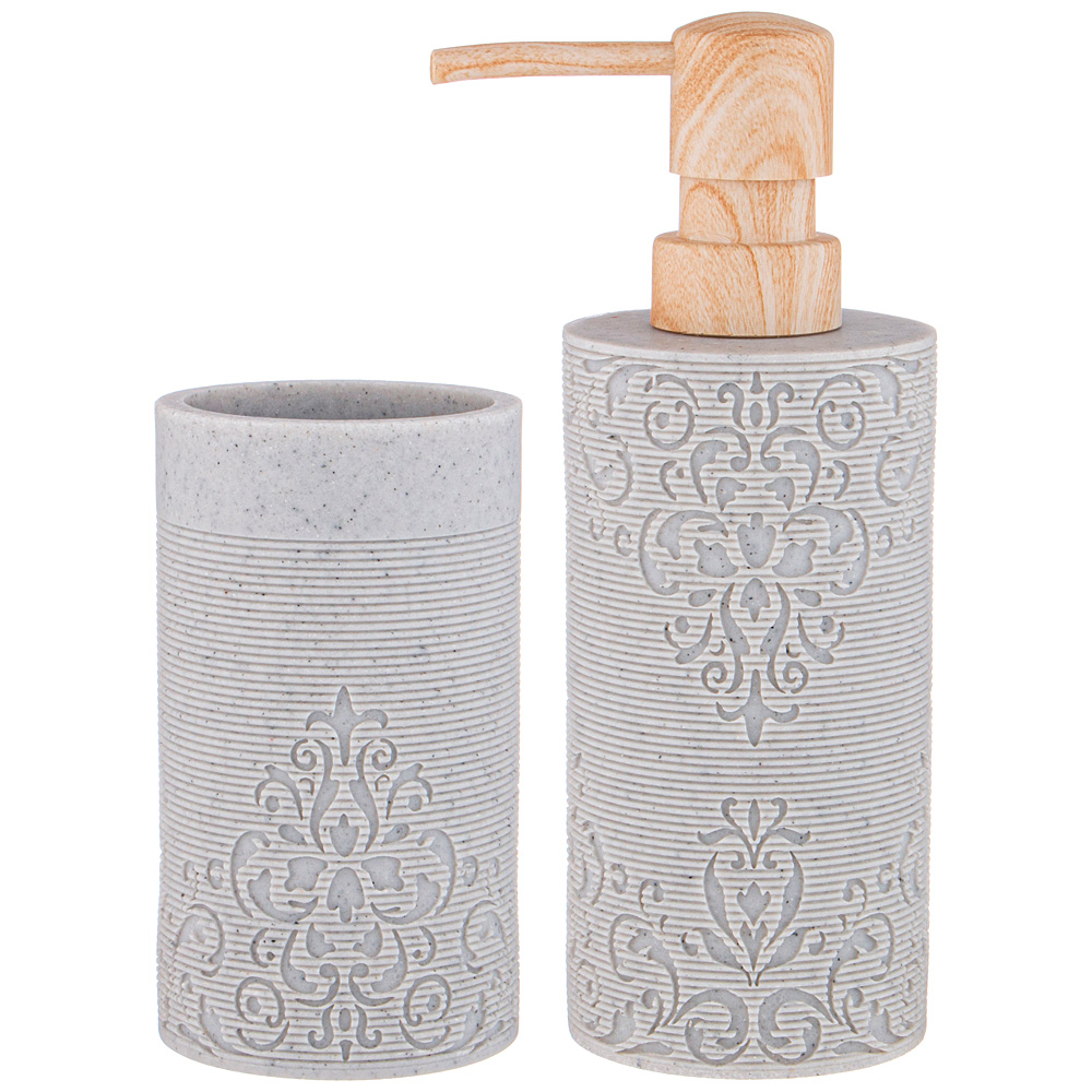 Набор аксессуаров для ванной комнаты состоит из дозатора для жидкого мыла и подставки-стакана.