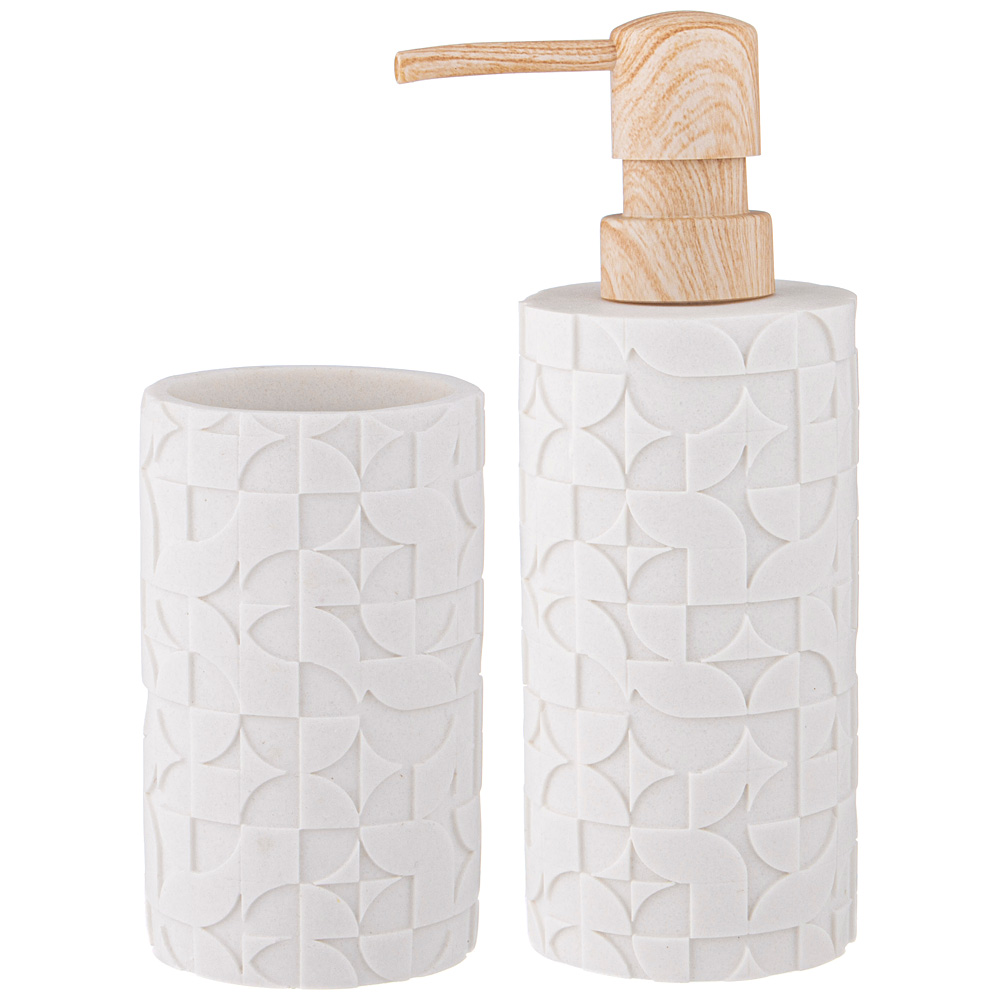 Набор аксессуаров для ванной комнаты состоит из дозатора для жидкого мыла и подставки-стакана.