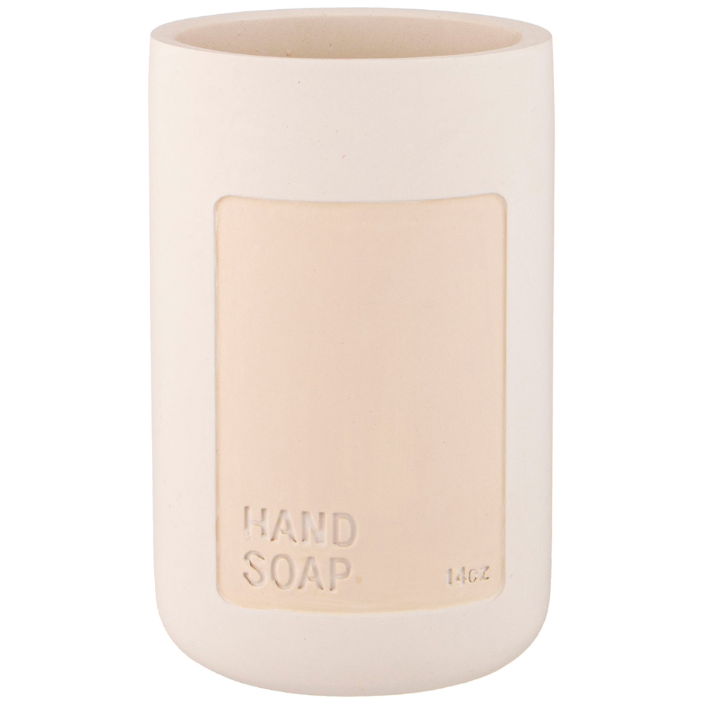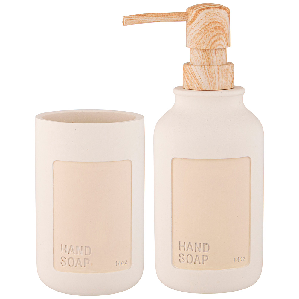 Набор аксессуаров для ванной комнаты состоит из дозатора для жидкого мыла и подставки-стакана.