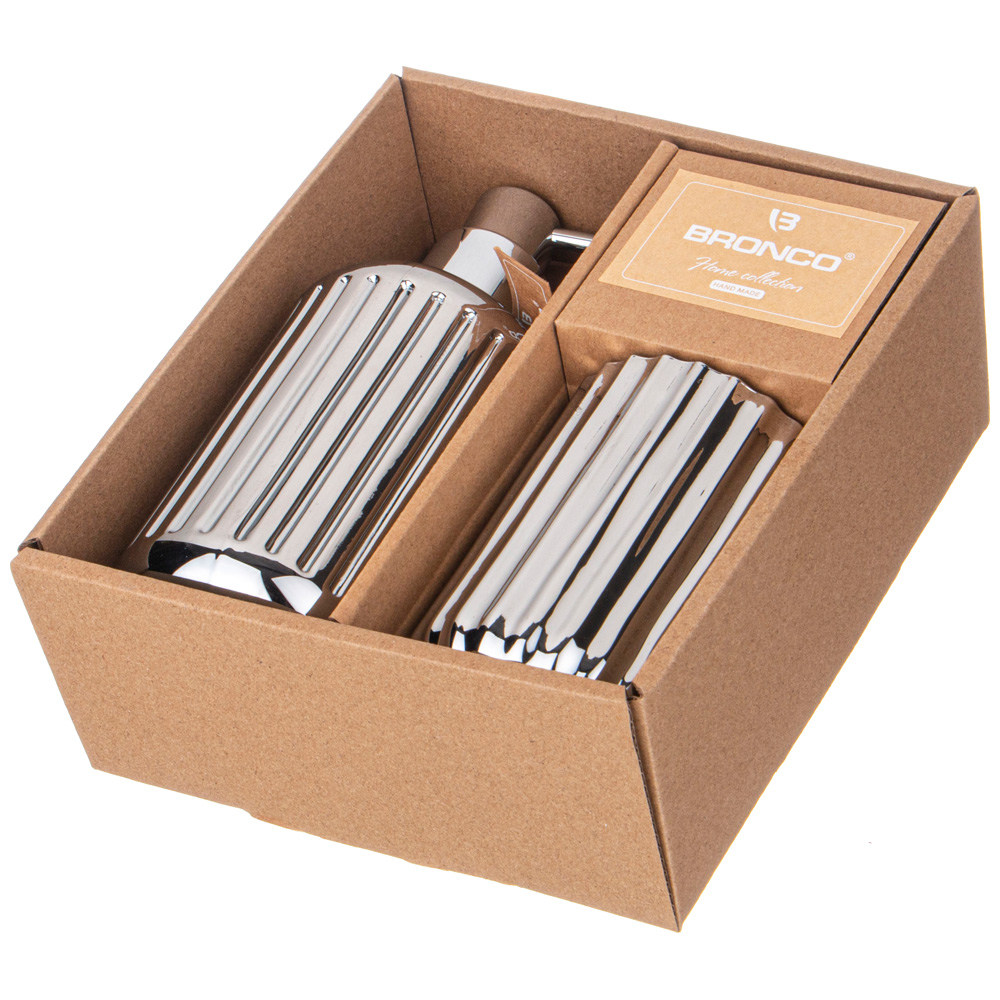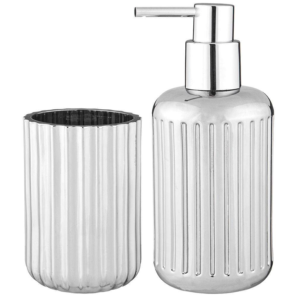 Набор аксессуаров для ванной комнаты состоит из дозатора для жидкого мыла и подставки-стакана.