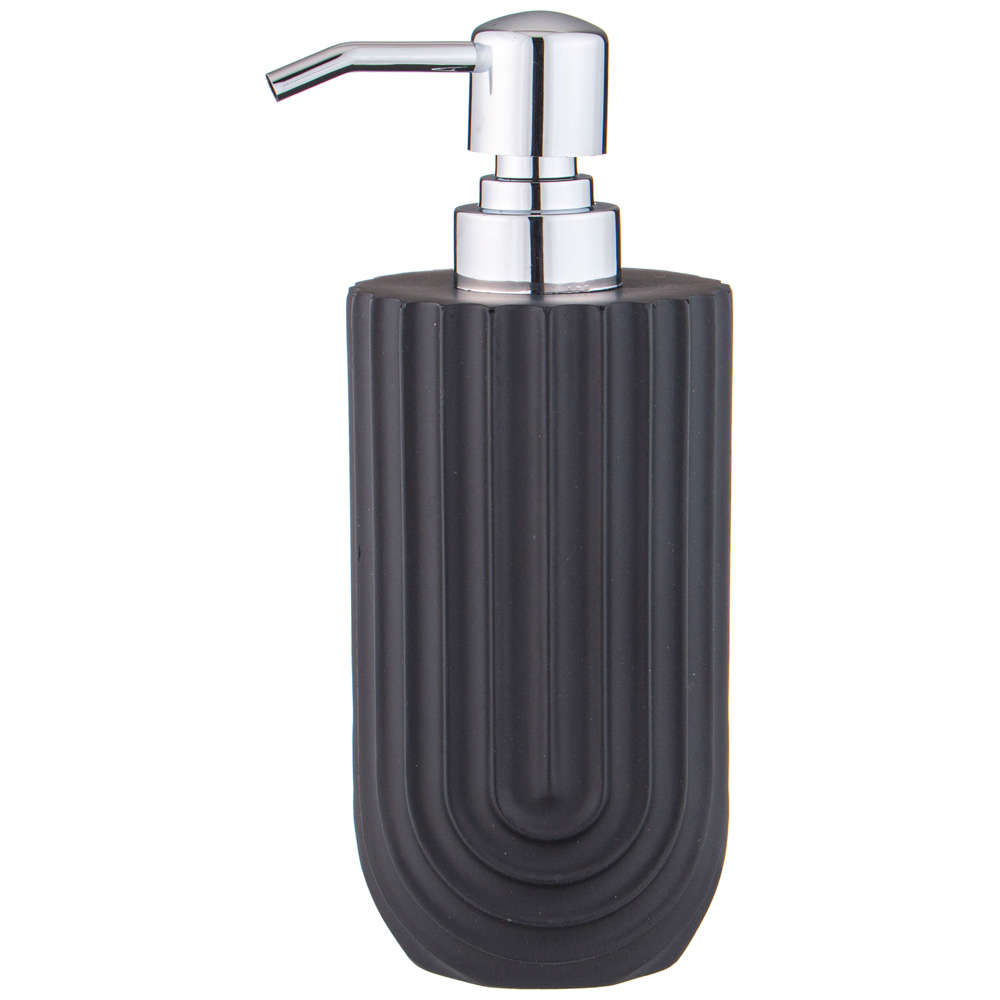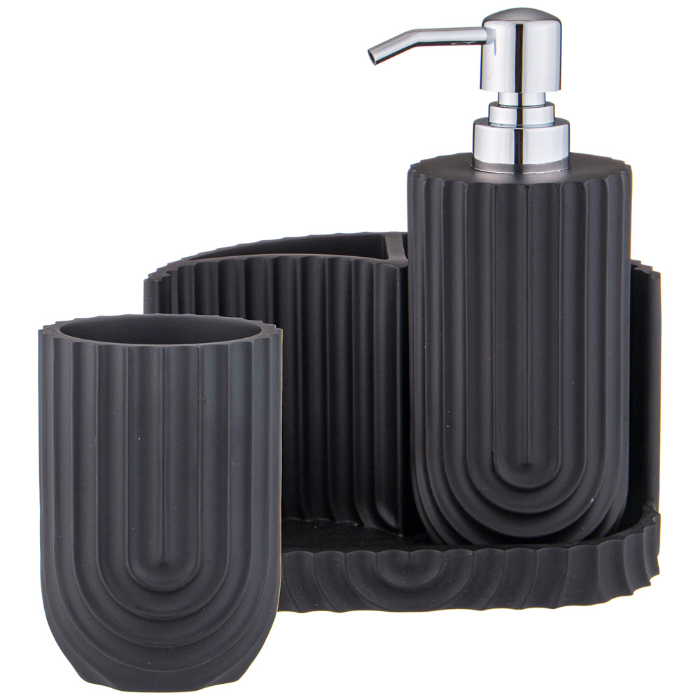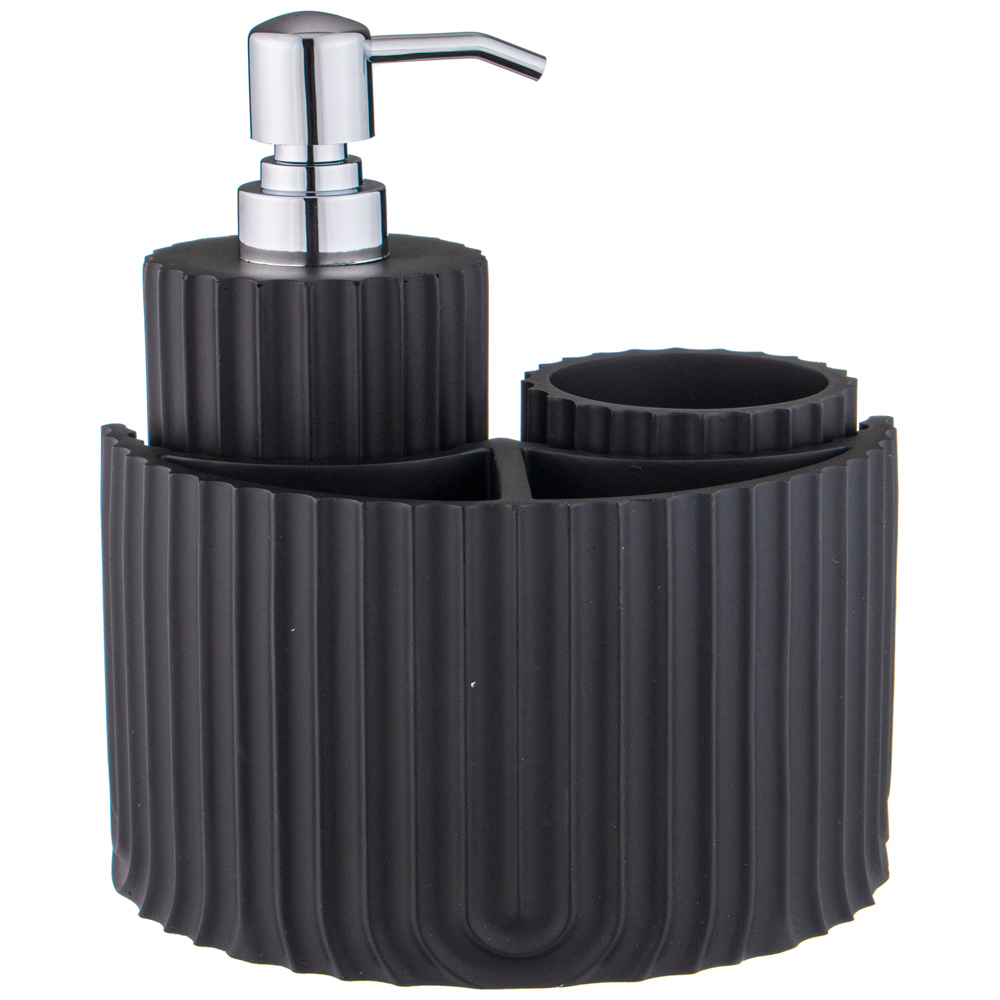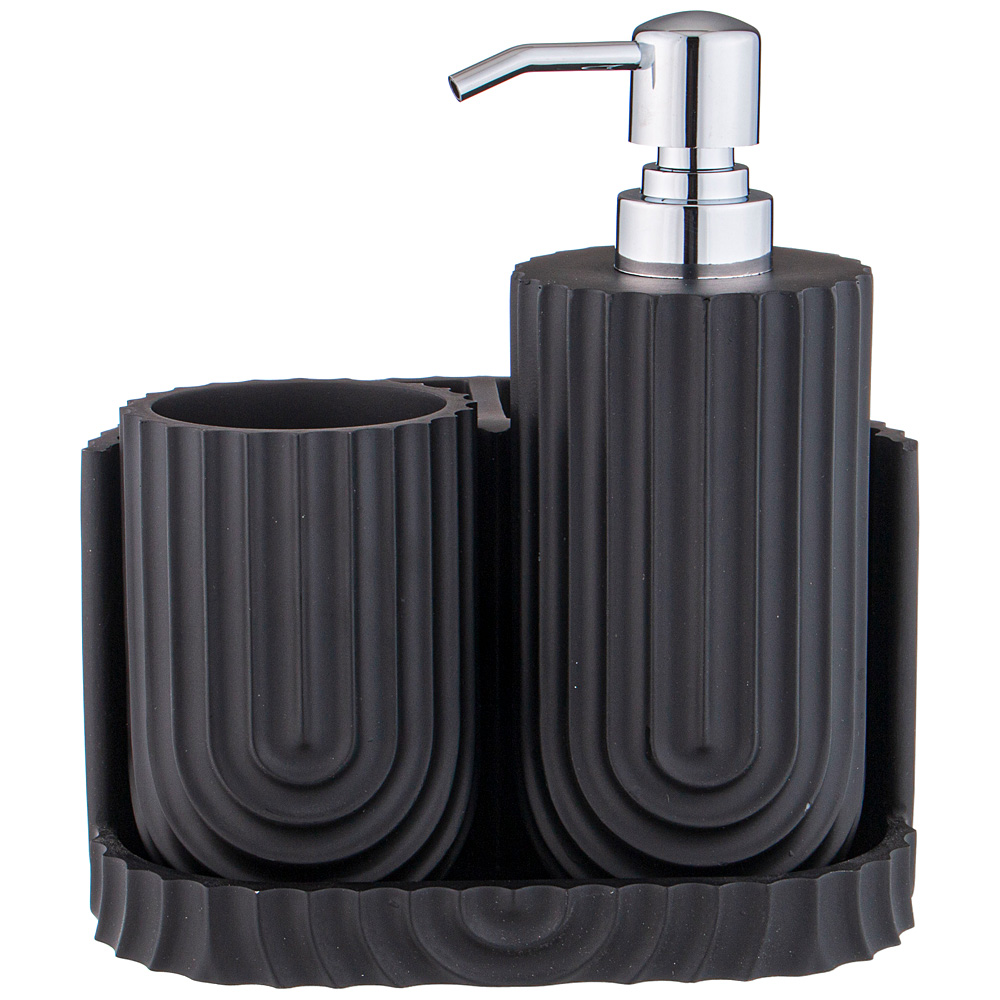 Набор аксессуаров для ванной комнаты состоит из дозатора для жидкого мыла, стакана и подставки.