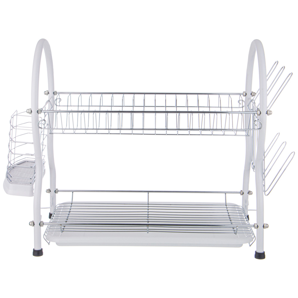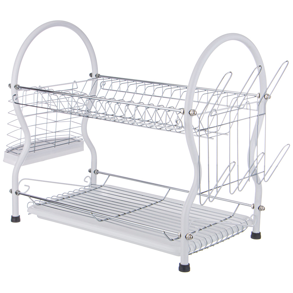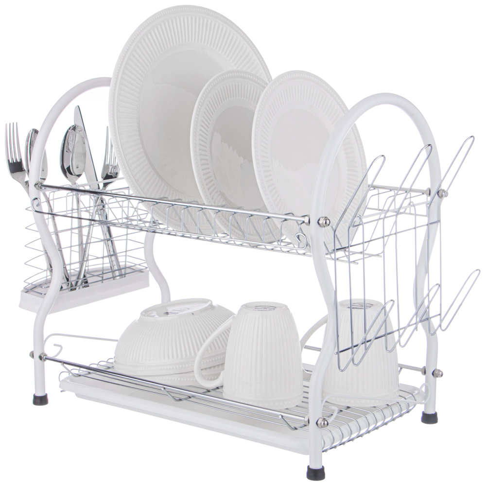 Настольная сушилка для посуды с пластиковым поддоном помогает посуде высохнуть прежде, чем она отправятся в шкаф. Также подходит для хранения часто используемых . Благодаря данному аксессуару они всегда будут в быстром доступе. Мокрая посуда не стоит на столешнице, благодаря чему она не деформируется и не растрескивается. Нет луж, все сухо и аккуратно. 5 причин купить настольные сушилки для посуды • эффектный индустриальный стиль украсит любой интерьер • гармонично вписывается в обстановку Минимализма, Лофта и Hi Tech • две широкие полки вмещает много мелких и глубоких тарелок • боковые держатели для сушки стаканов и кружек • корзинка для сушки/хранения кухонных принадлежностей (лопаток, шумовок).