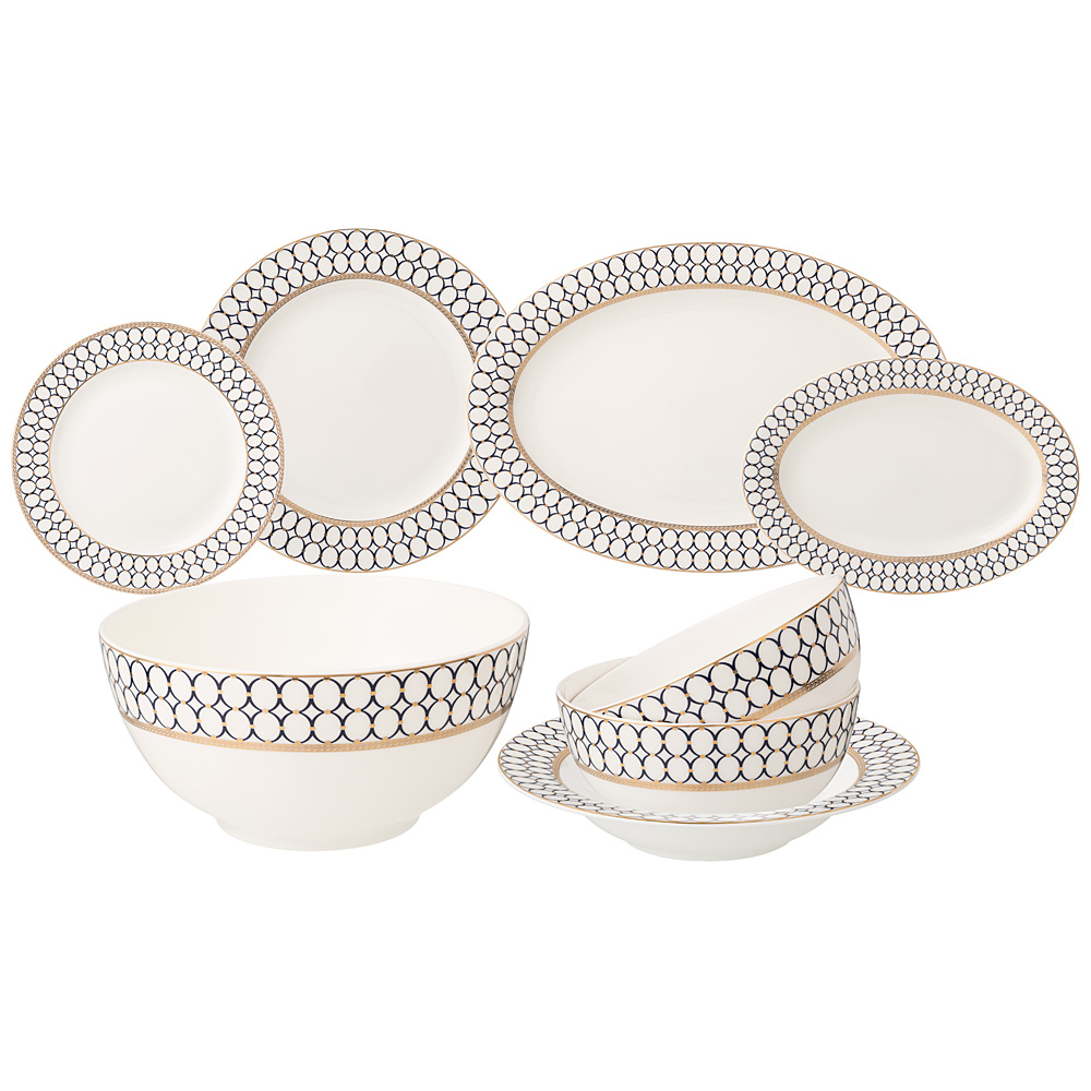 Комплектность: тарелка обеденная 25,5 см 6 шт., тарелка закусочная 20,5 см 6 шт., тарелка суповая 23 см 6 шт., салатник 23 см 1750 мл, салатник 16 см 750 мл 2 шт., блюдо овальное 36 см. блюдо овальное 23 см.