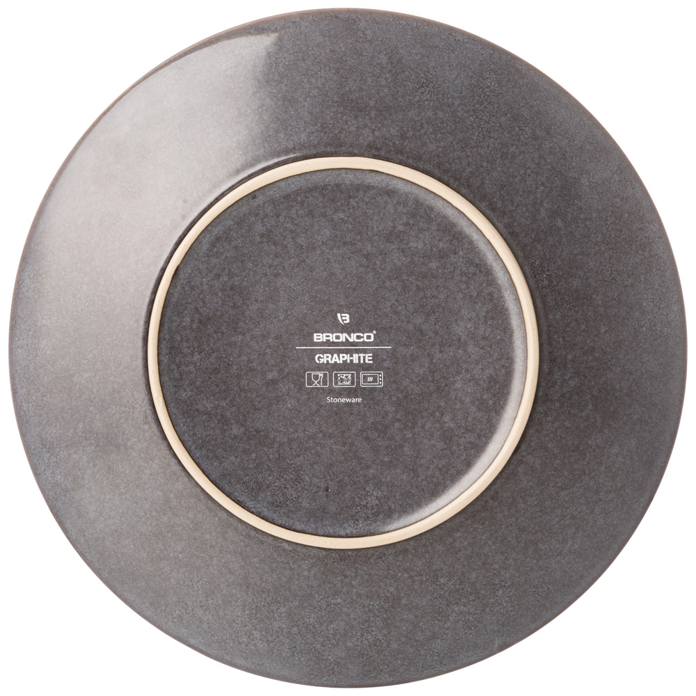 Коллекция ТМ BRONCO Graphite глубокого серого цвета с великолепным графическим подглазурным рисунком и стильной удобной формы оптимальных размеров. Все изделия выполнены из высокотемпературной каменной керамики и обожжены при температуре от 1100 до 1400 градусов. При такой температуре вода и воздух из глиняной массы полностью испаряются и изделия становятся легче, плотнее, крепче, приближаясь по своим характеристикам к фарфору. Современные рестораторы выбирают каменную керамику именно из-за её прочности и стойкости к перепадам температур. Поверхность изделий покрыта глянцевой реактивной глазурью. Изделия не впитывают вкусы и запахи продуктов, хорошо сохраняют тепло и холод. Они легки в уходе, вызывают приятные тактильные ощущения, длительное время сохраняют первоначальный внешний вид. Каменную керамику можно мыть в посудомоечной машине, использовать в микроволновой печи.