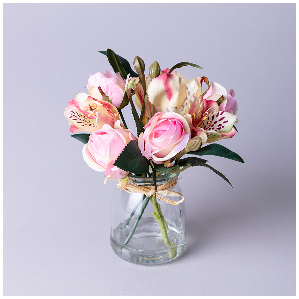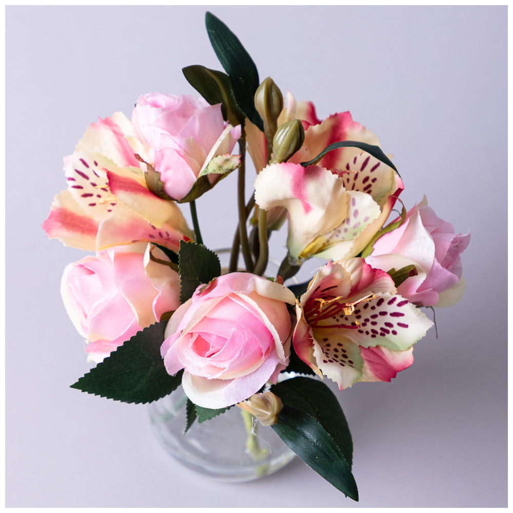 БУКЕТ ИСКУССТВЕННЫХ ЦВЕТОВ В КРУГЛОЙ ВАЗЕ ВЫСОТА= 16СМ (МАЛ=8ШТ./КОР=64ШТ.)