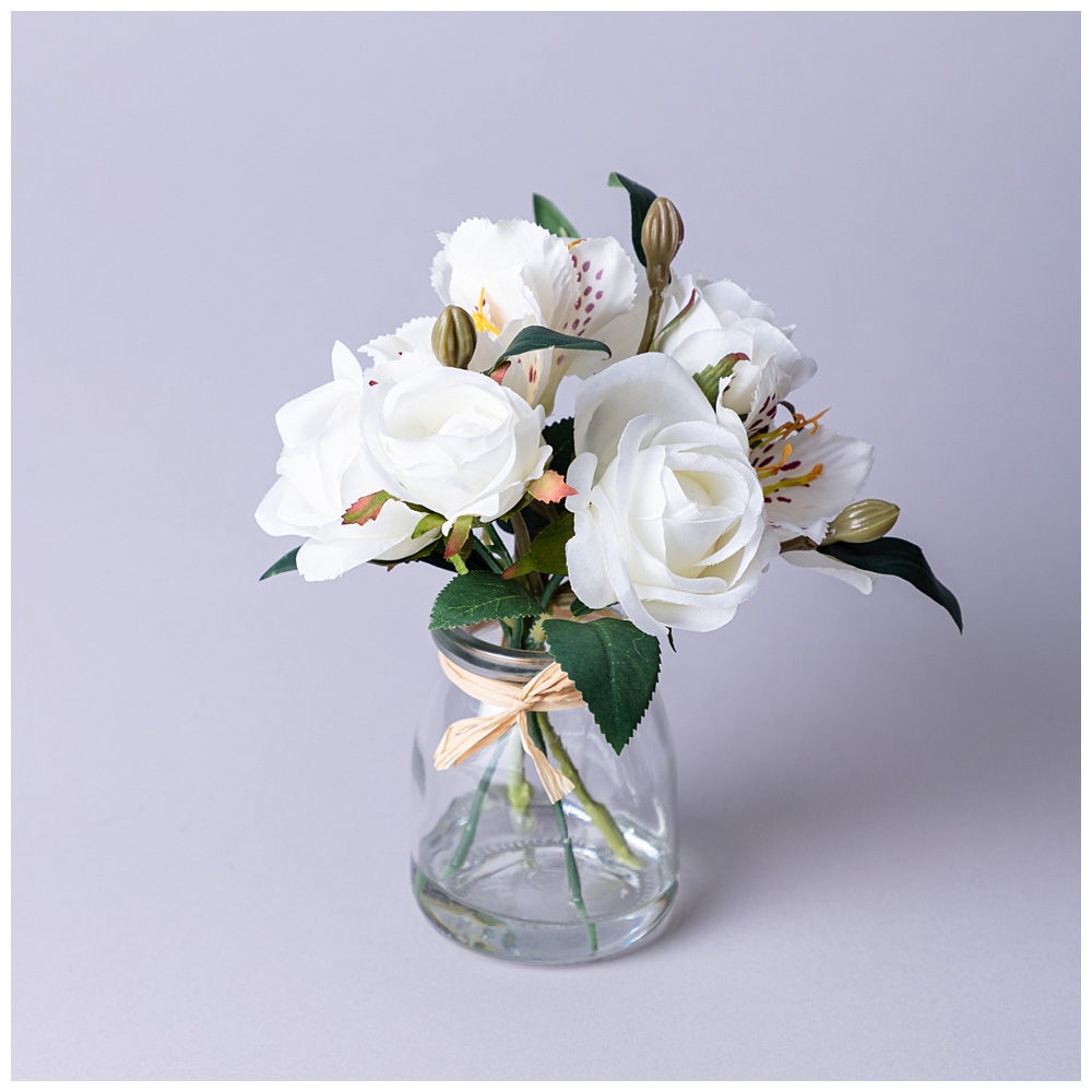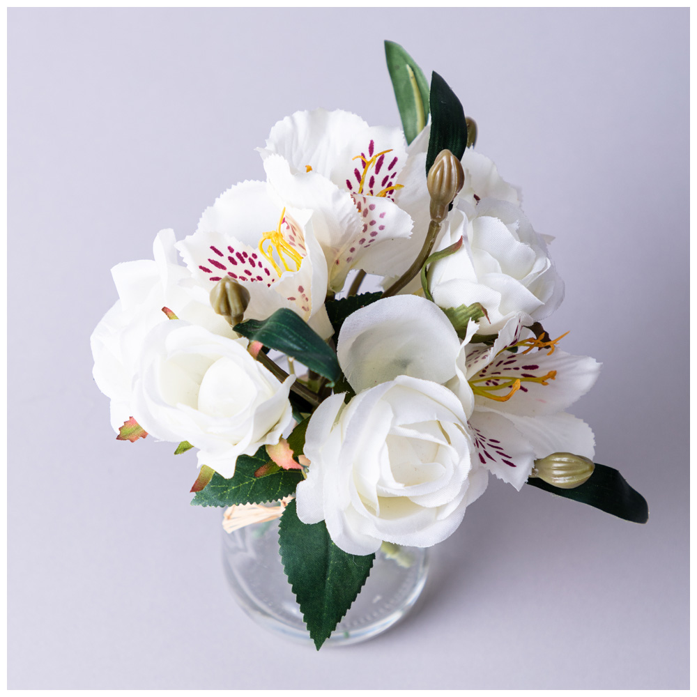 БУКЕТ ИСКУССТВЕННЫХ ЦВЕТОВ В КРУГЛОЙ ВАЗЕ ВЫСОТА= 16СМ (МАЛ=8ШТ./КОР=64ШТ.)