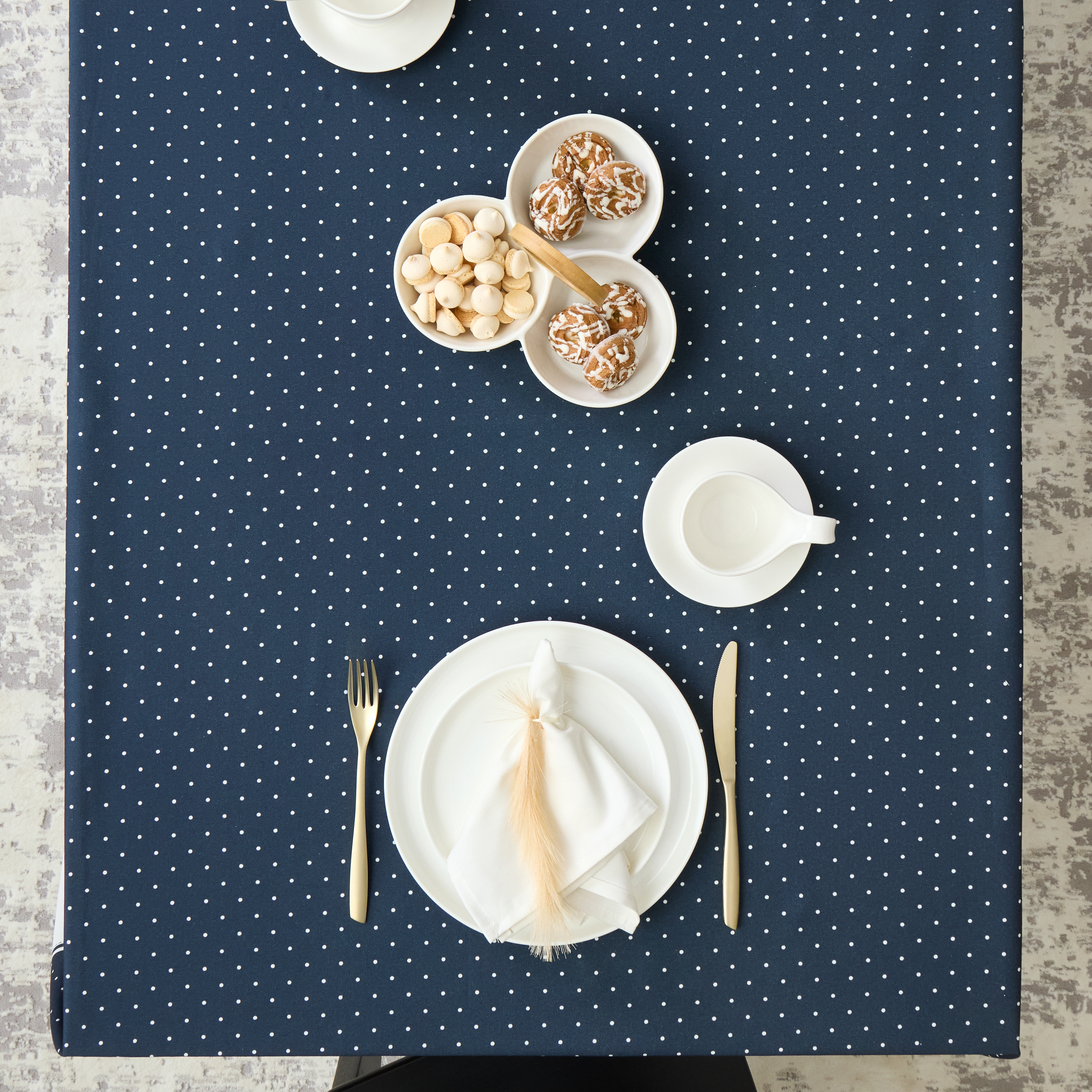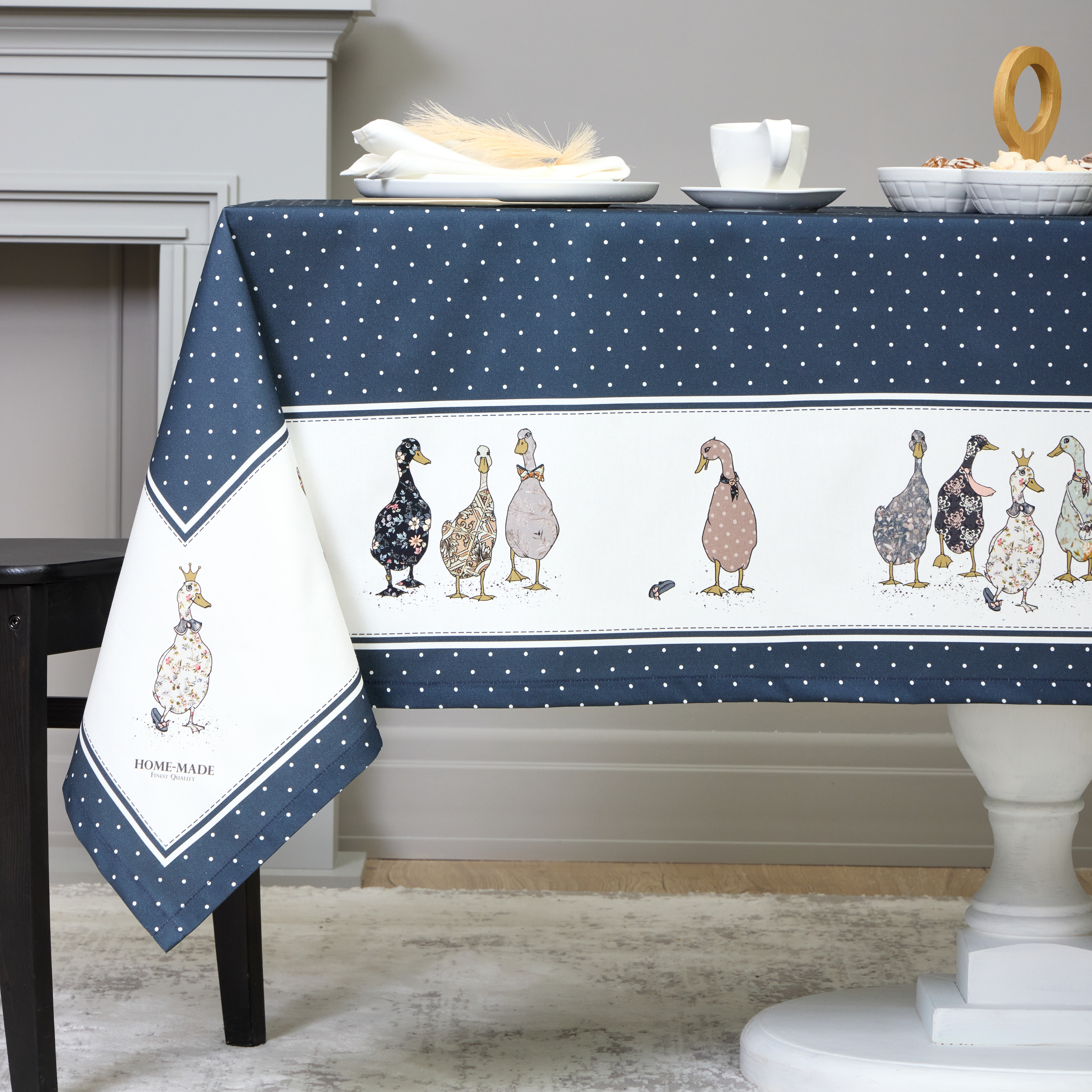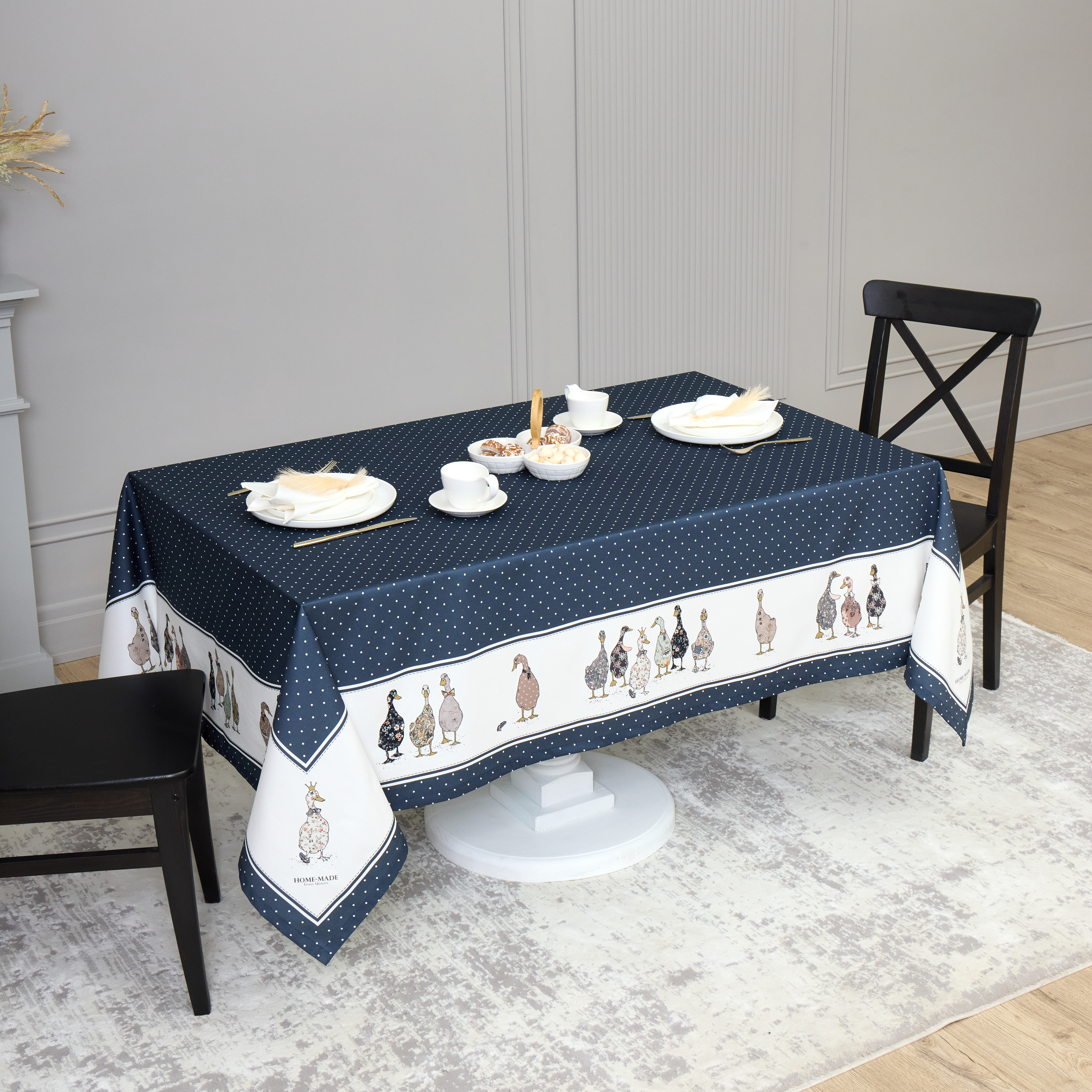 Тканевая, но прочная, сделанная из 100% хлопка, добавлена водоотталкивающая пропитка, что делает ее влагостойкой и непромокаемой, идеальный выбор для повседневного использования. Наша скатерть для обеденного стола сочетает в себе красоту и практичность, обеспечивая идеальный фон для ваших семейных ужинов.