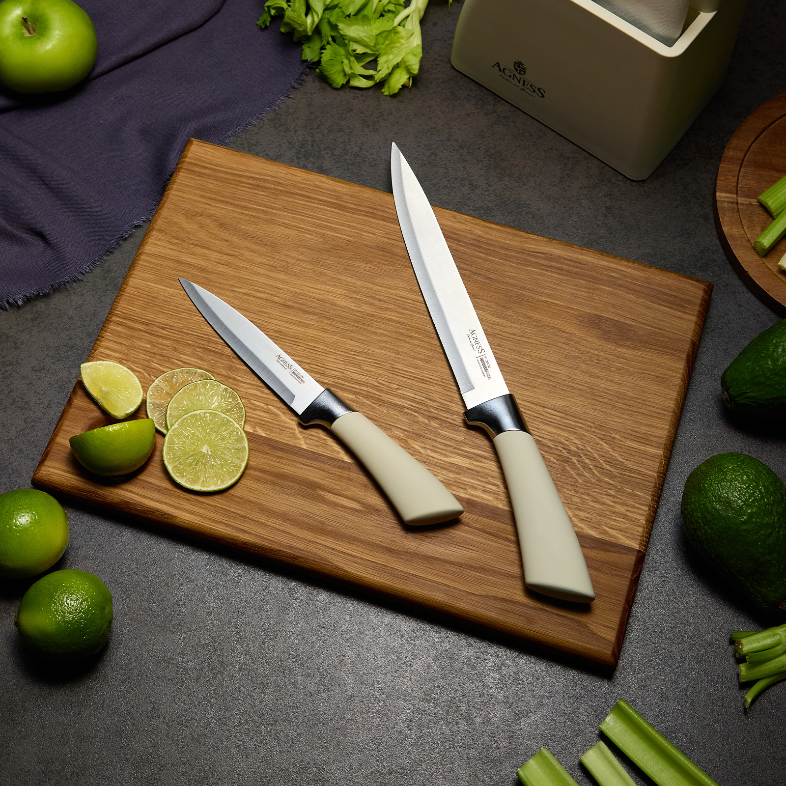 Нож - главный инструмент на кухне, а вернее ножи, т.к. даже самый лучший нож не сможет справиться со всем многообразием задач. Выбирая набор ножей AGNESS - Вы приобретаете комплект самых необходимых и чаще всего используемых ножей. Преимущества ножей AGNESS: