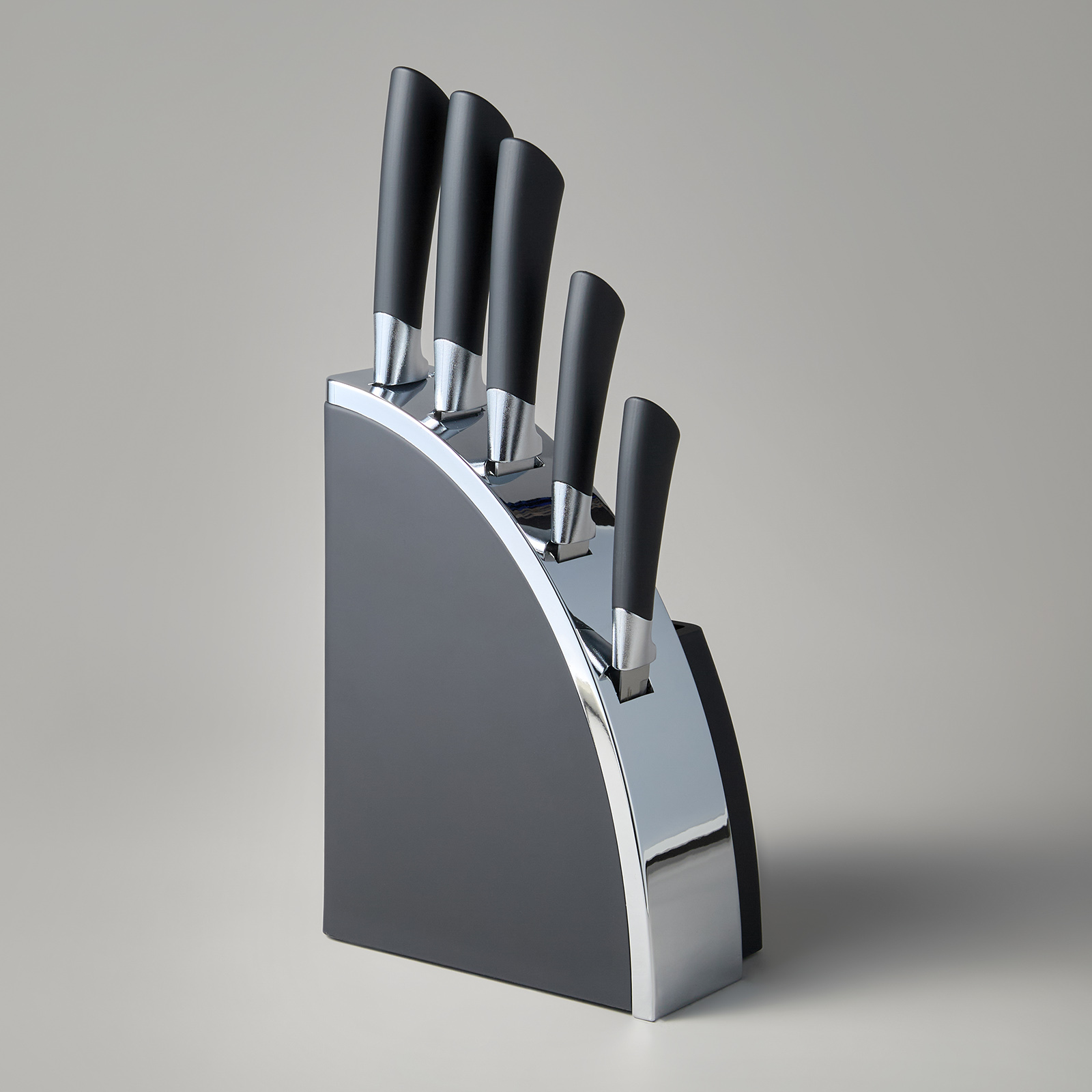 ● Состав набора: Нож поварской 20см, Нож для нарезки 20см, Нож для хлеба 20см, Нож универсальный 12,5см, Нож для чистки овощей и фруктов, 9см, Удобная пластиковая подставка для безопасного хранения ножей.