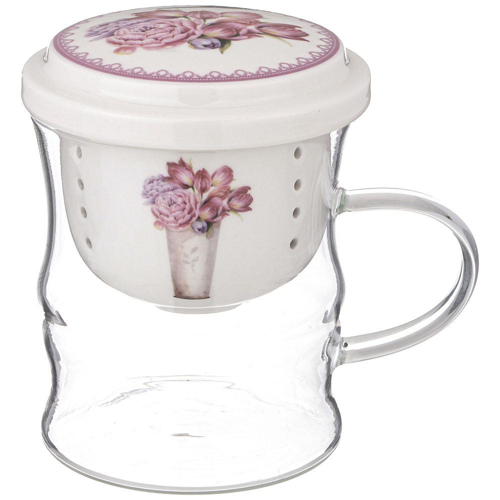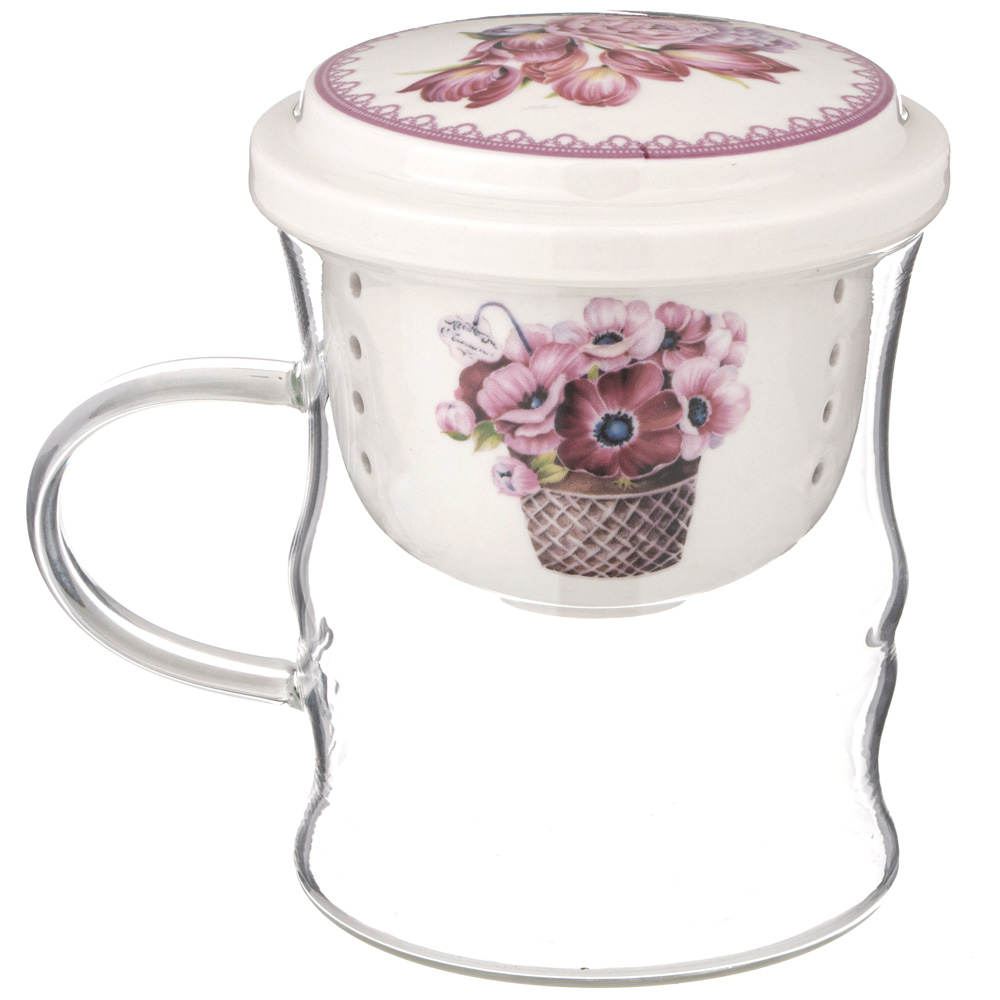 КРУЖКА СТЕКЛЯННАЯ С ФАРФОРОВЫМ СИТОМ LEFARD ТЮЛЬПАНЫ 420 МЛ