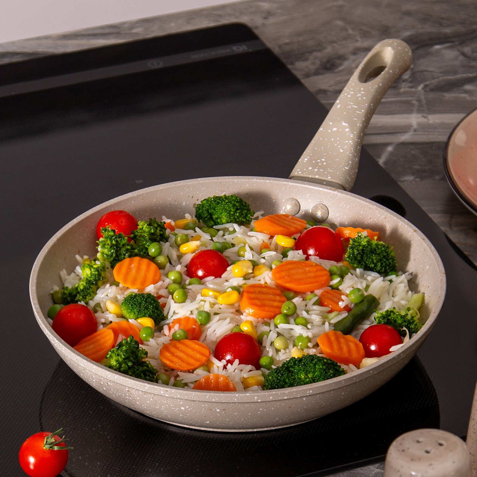 СКОВОРОДА AGNESS С АНТИПРИГАРНЫМ ПОКРЫТИЕМ "LATTE" - это идеальный выбор для тех, кто ценит удобство и функциональность в посуде. Одним из главных достоинств этой сковороды является ее антипригарное покрытие, которое позволяет готовить без использования большого количества масла, а также обеспечивает равномерное распределение тепла. Благодаря этому, продукты готовятся быстрее и сохраняют свои полезные свойства.Быстрое нагревание сокращает время приготовления и сохраняет вкус и аромат продуктов. Многослойная структура покрытия обеспечивает превосходные эксплуатационные качества и увеличивает срок службы, не содержит PFOA.Эргономичная ручка из бакелита с мягким покрытием SOFT TOUCH не нагревается и не плавится, обеспечивает безопасное использование сковородки в процессе приготовления пищи. Посуда AGNESS - это современный дизайн и новейшие технологии производства.