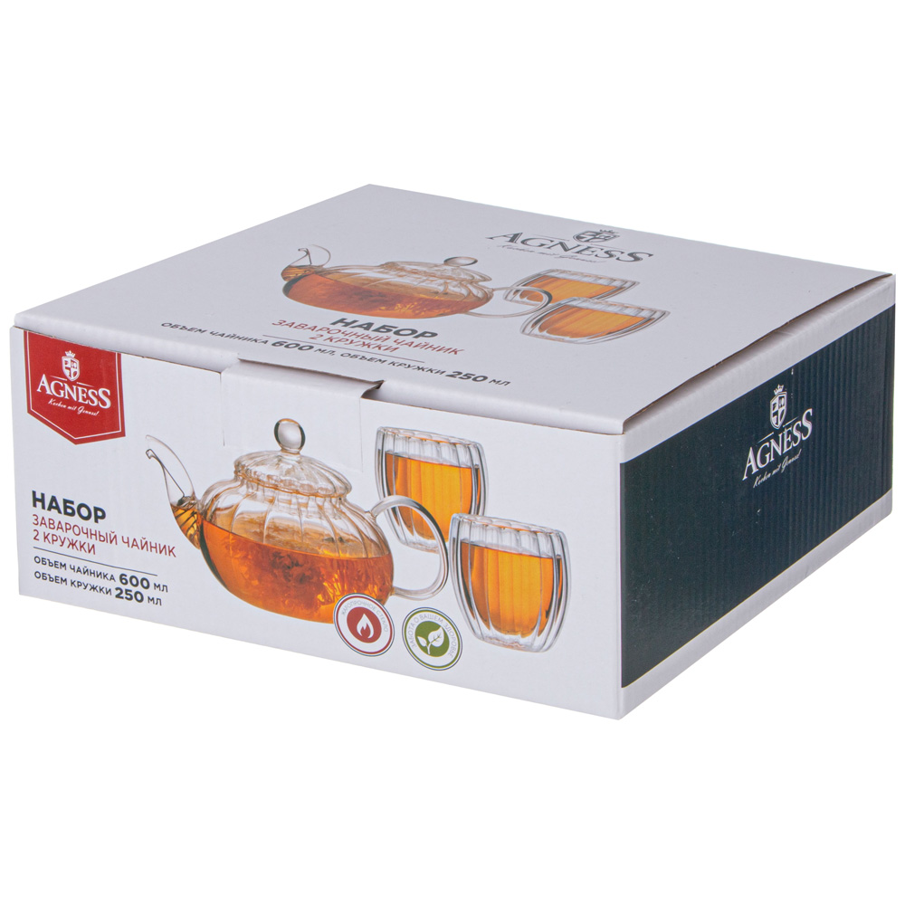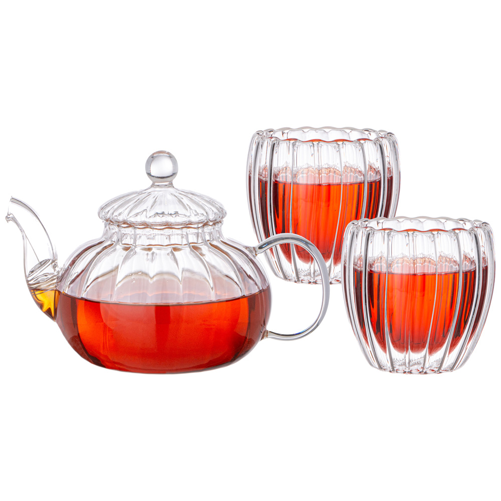 Заварочный стеклянный чайник и кружки выполнены в красивой рельефной форме, что позволяет бесконечно долго любоваться процессом заваривания.
