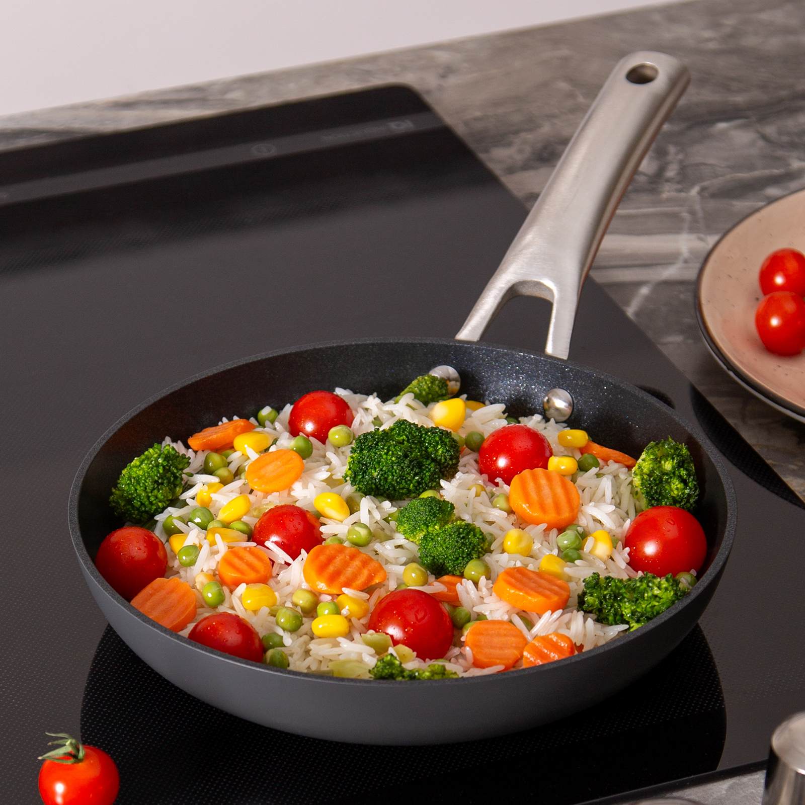 СКОВОРОДА C АНТИПРИГАРНЫМ ПОКРЫТИЕМ "CHEF"AGNESS выполнена из толстостенного прессованного алюминия 3,5мм , что гарантирует быстрый и равномерный нагрев.Сверхпрочная трехслойная структура антипригарного покрытия Daikin обеспечивает превосходные эксплуатационные качества и долгий срок службы посуды. Внешняя стенка имеет низкую теплопроводность и отлично сохраняет температуру на протяжении длительного времени, давая возможность блюду настояться и полностью раскрыться всем вкусовым составляющим. Посуда серии CHEF бренда AGNESS - это современный дизайн и передовые технологии.