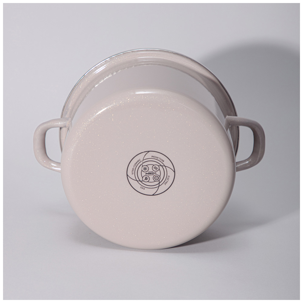 Толщина корпуса без эмалированного покрытия 0,7мм. 3-х слойное эмалированное покрытие - грунтовое, базовое и финишное покрытие с глиттером. Подходит для всех типов плит, включая индукционные. Можно мыть в посудомоечной машине.