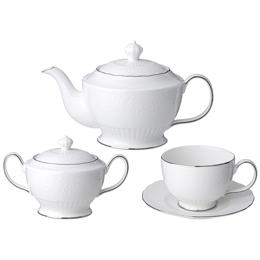 ТМ LEFARD коллекция "BOUQUET" с ботаническим рельефным рисунком и изящной платиновой полосой. Так и хочется пробежаться по роскошному лугу, упасть в траву и замереть, слиться с этим миром и услышать стрёкот кузнечиков, гул шмелей, шелест лёгких крыльев стрекоз и бабочек. Упрочненный высококачественный тонкий фарфор. Современные эксклюзивные формы, украшенные рельефными линиями, удобные размеры. Обеденные и закусочные тарелки, суповая тарелка - салатник, овальные блюда и салатники различного назначения - все это делает сервировку ежедневного и праздничного стола изящной и неповторимой. Белый рельефный фарфор прекрасно сочетается с декорированной частью коллекции. Это прекрасный подарок. Посуда прошла сертификацию. Безопасна для контакта с пищевыми продуктами. Мыть с применением мягких моющих средств. Нельзя использовать в микроволновой печи, не рекомендуется мыть в посудомоечной машине. Комплектность: чайник 900 мл, сахарница 400 мл, 6 чашек 280 мл, 6 блюдец.