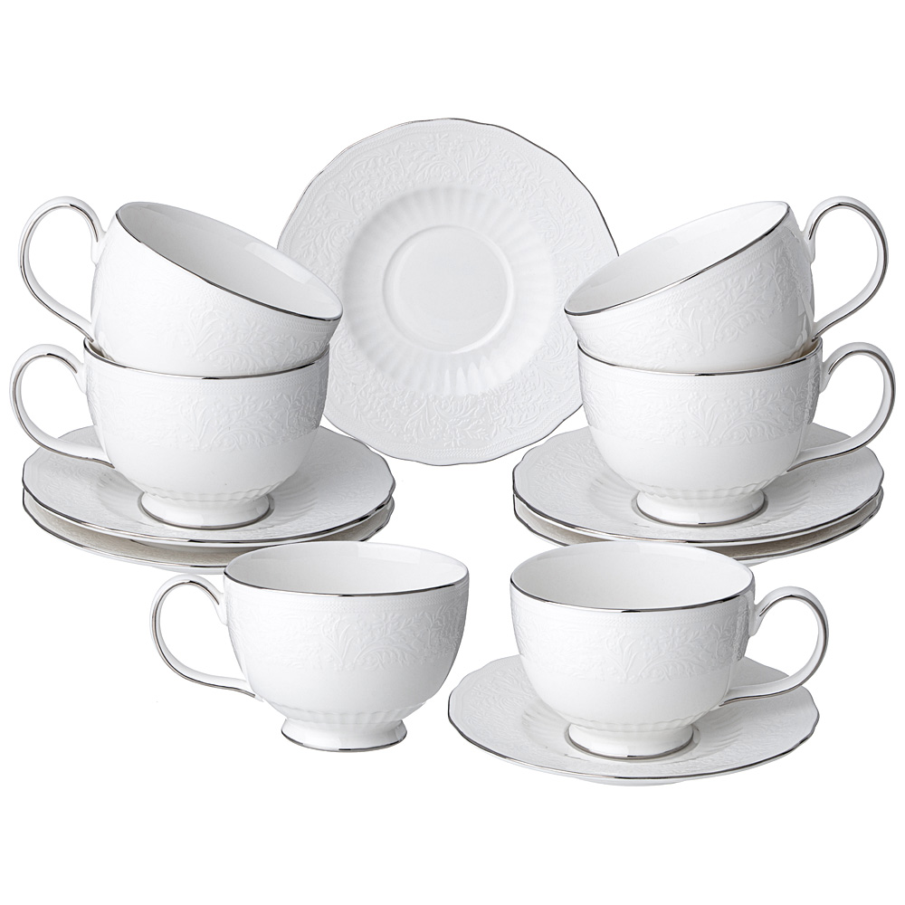 ТМ LEFARD коллекция "BOUQUET" с ботаническим рельефным рисунком и изящной платиновой полосой. Так и хочется пробежаться по роскошному лугу, упасть в траву и замереть, слиться с этим миром и услышать стрёкот кузнечиков, гул шмелей, шелест лёгких крыльев стрекоз и бабочек. Упрочненный высококачественный тонкий фарфор. Современные эксклюзивные формы, украшенные рельефными линиями, удобные размеры. Обеденные и закусочные тарелки, суповая тарелка - салатник, овальные блюда и салатники различного назначения - все это делает сервировку ежедневного и праздничного стола изящной и неповторимой. Белый рельефный фарфор прекрасно сочетается с декорированной частью коллекции. Это прекрасный подарок. Посуда прошла сертификацию. Безопасна для контакта с пищевыми продуктами. Мыть с применением мягких моющих средств. Нельзя использовать в микроволновой печи, не рекомендуется мыть в посудомоечной машине. Комплектность: 6 чашек 280 мл, 6 блюдец