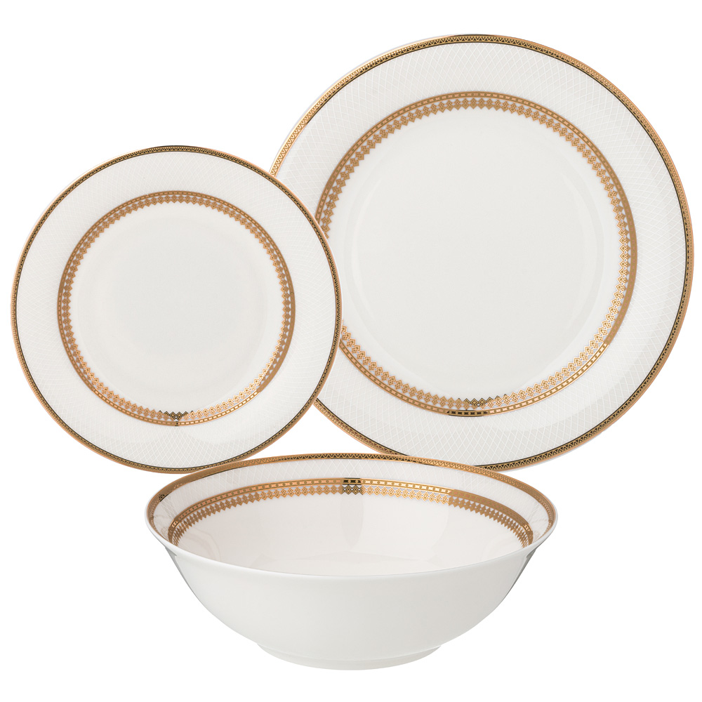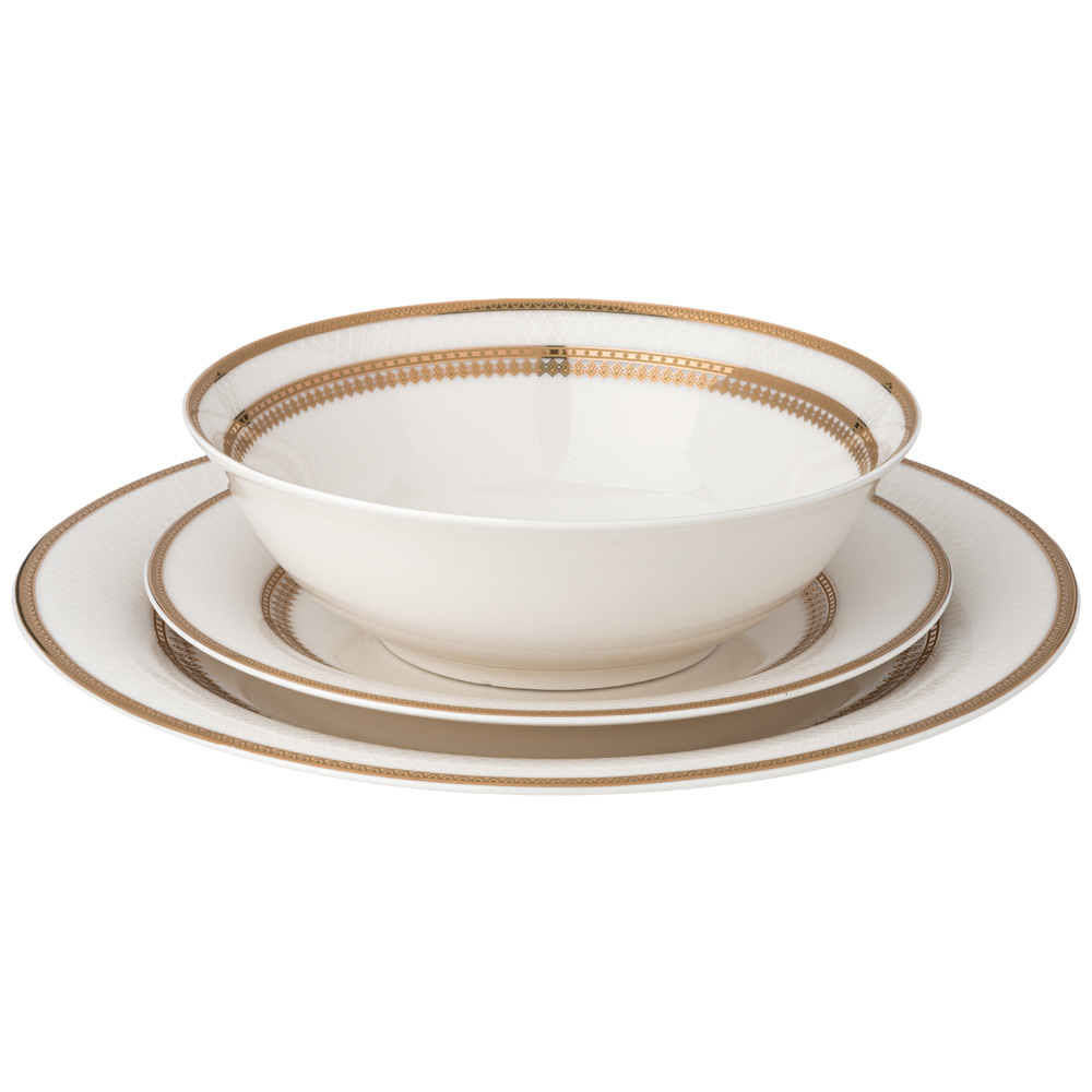 ТМ LEFARD Набор посуды столовой "Праздничный" для торжественных застолий и семейных обедов. Изысканный фарфор Bone Pocelain с эффектом костяного фафора, тонкий и полупрозрачный, прочный и никогда не темнеет. Классический рельефный орнамент в виде сетки выглядит объемным и привлекательным. Пересекающиеся линии уходят в бесконечность. Состояние движения подталкивает к движению вперед, наполняя энергией. Изящный золотой кант придает блеск и торжественность. Эта посуда замечательный подарок на юбилей, день рождения, новоселье, который наверняка пригодится каждой семье, запомнится навсегда и прослужит долгие годы. Дизайнеры торговой марки предлагают чайный и обеденный сервизы и наборы чайных пар, чтобы сформировать полную сервировку стола предметами коллекции на 6 или 12 персон.