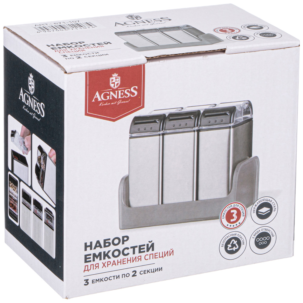 НАБОР ЕМКОСТЕЙ ДЛЯ СПЕЦИЙ ИЗ НЕРЖ.СТАЛИ 3ШТ AGNESS выполнены из высококачественных материалов, данные товары являются прочными и долговечными. Элегантный дизайн делает набор стильным элементом интерьера. Компактный размер позволяет удобно хранить набор на кухне, не занимая много места. Добавьте вкуса и аромата в каждое блюдо с помощью этих стильных и практичных кухонных аксессуаров. Набор для специй идеально подходит для хранения специй на кухонном и обеденном столе. Крышка емкостей имеет небольшое отверстие-дозатор, также может открываться полностью. Отличное решение для оптимизации пространства на кухне.