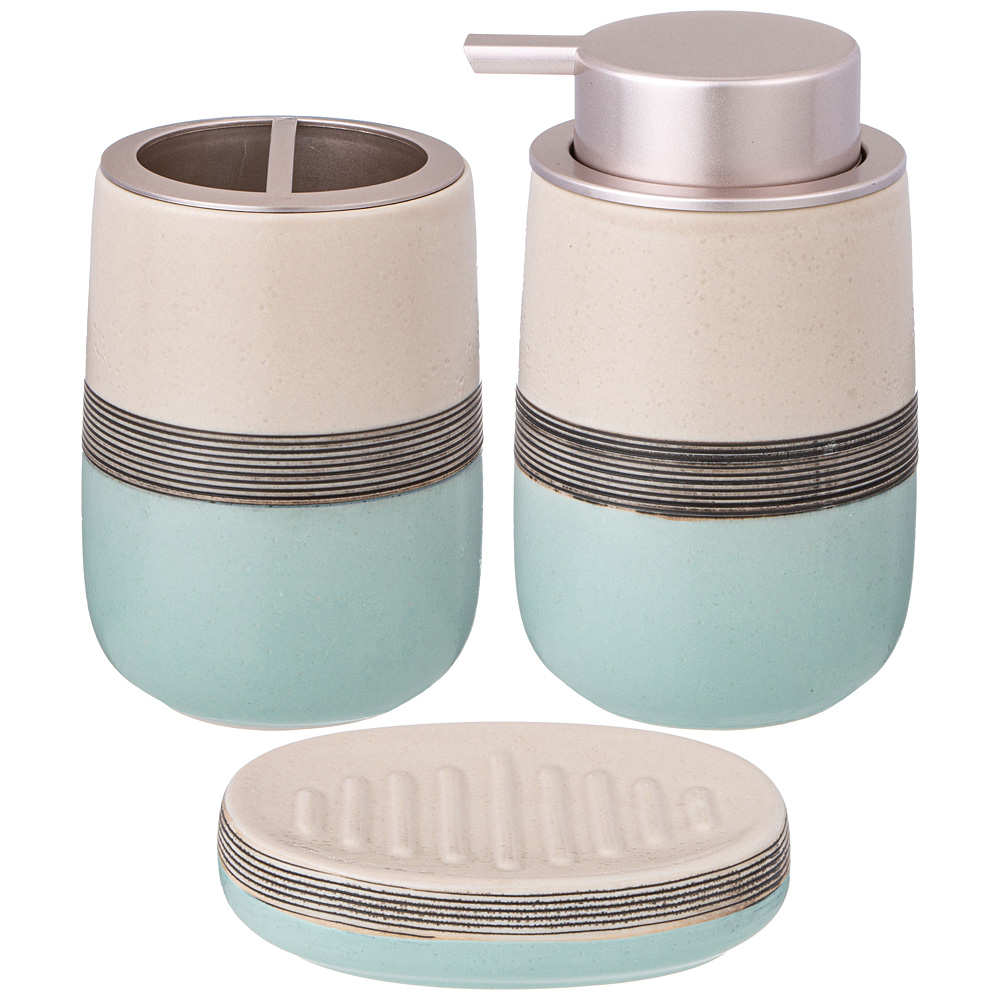 Секрет удачного оформления любого интерьера — яркие аксессуары! Дозатор для ванной не только внесёт изюминку в интерьер, но и придаст ему стильность, уют и ощущение завершенности. В комплект входит дозатор для жидкого моющего средства, мыльница и стакан для зубных щеток.