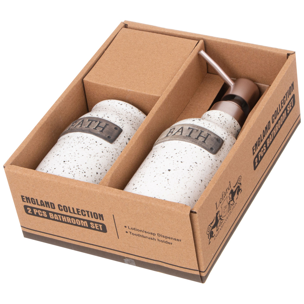 Секрет удачного оформления любого интерьера — яркие аксессуары! Набор предметов для ванной не только внесёт изюминку в интерьер, но и придаст ему стильность, уют и ощущение завершенности. А так же значительно облегчит хранение некоторых принадлежностей. В комплект входят: дозатор для жидкого мыла и стакан для зубных щеток.