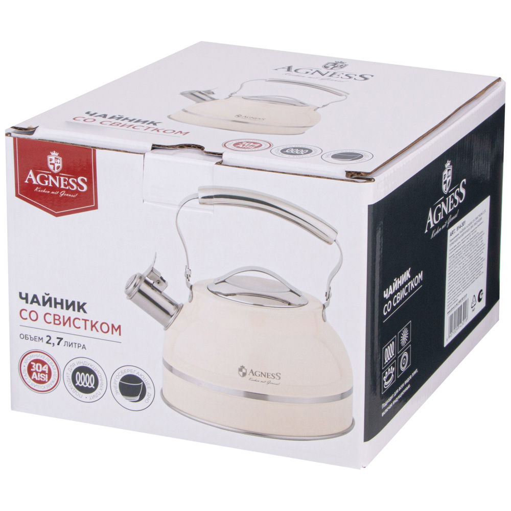 ЧАЙНИК AGNESS СО СВИСТКОМ 2,7Л, ТЕРМОАККУМУЛИРУЮЩЕЕ ДНО, 304 СТАЛЬ, ИНДУКЦИЯ