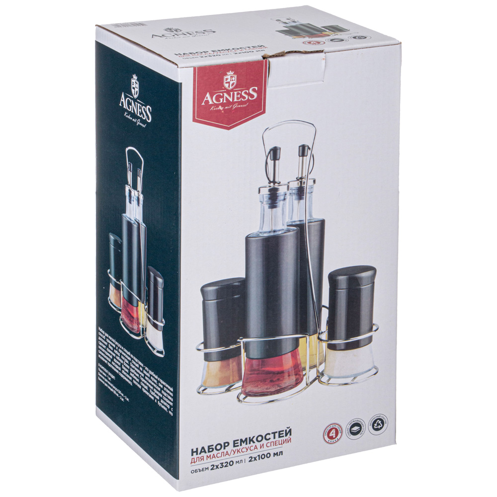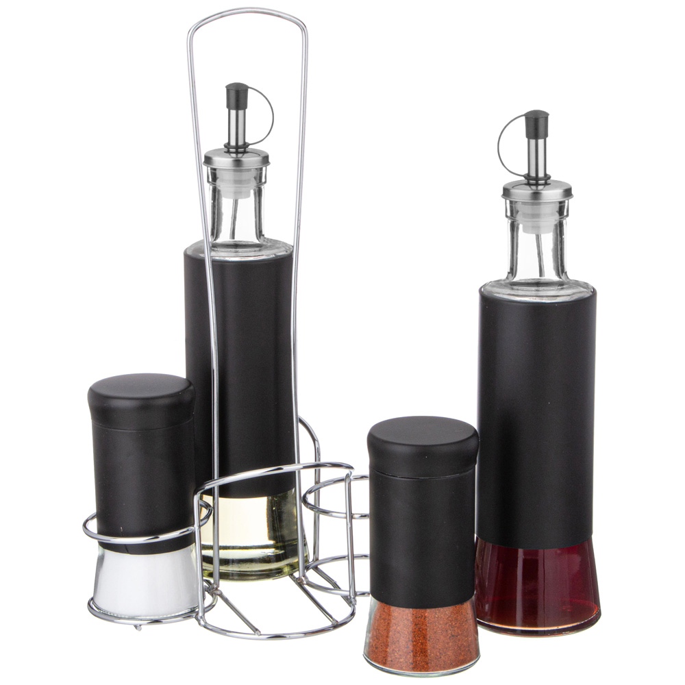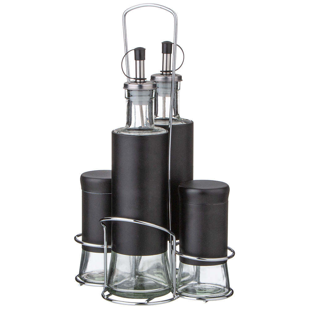 Набор для масла/уксуса и специй на подставке - это удобный и практичный способ хранения и организации специй на вашей кухне, они отлично дополнят Ваш набор посуды. Оригинальная металлическая подставка сделает хранение набора более удобным. Гермитичные крышки сохранят неповторимый аромат Ваших любимых специй. Удобный дозатор с силиконовой насадкой обеспечит плотное прилегание к бутылке, что исключит протекание содержимого.