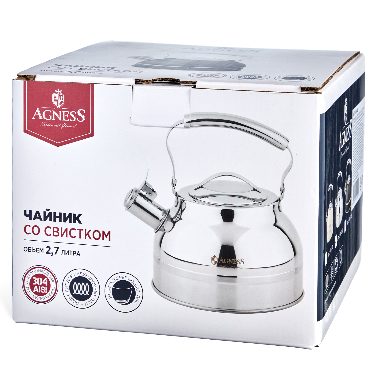 ЧАЙНИК AGNESS СО СВИСТКОМ 2,7Л, ТЕРМОАККУМУЛИРУЮЩЕЕ ДНО, 304 СТАЛЬ, ИНДУКЦИЯ