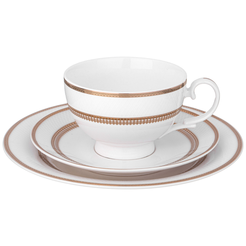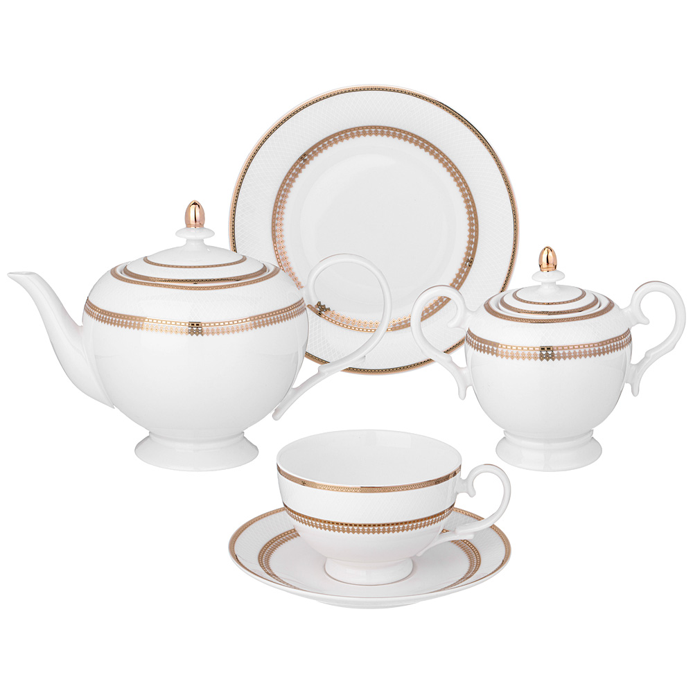 ТМ LEFARD Сервиз чайный "Праздничный" для торжественного чаепития и семейных застолий. Изысканный фарфор Bone Pocelain с эффектом костяного фафора, тонкий и полупрозрачный, прочный и никогда не темнеет. Утонченный кружевной рельефный орнамент выглядит объемным и привлекательным благодаря различной обработке выпуклых и базовых поверхностей. Изящная золотая обводка придает блеск и торжественность. Эта посуда замечательный подарок на юбилей, день рождения, новоселье, который наверняка пригодится каждой семье, запомнится навсегда и прослужит долгие годы. Дизайнеры торговой марки предлагают обеденный сервиз и наборы тарелок и чайных пар, чтобы сформировать полную сервировку стола предметами коллекции на 6 или 12 персон.