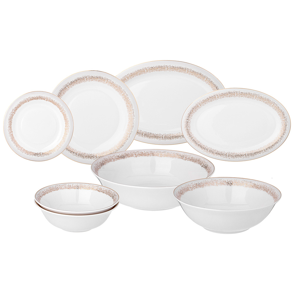 ТМ LEFARD Сервиз столовый "Золотой песок" для торжественных застолий и семейных обедов. Изысканный фарфор Bone Pocelain с эффектом костяного фафора, тонкий и полупрозрачный, прочный и никогда не темнеет. Классический рельефный орнамент в виде сетки выглядит объемным и привлекательным. Пересекающиеся линии уходят в бесконечность. Состояние движения подталкивает к движению вперед, наполняя энергией. Изящный золотой кант придает блеск и торжественность. Эта посуда замечательный подарок на юбилей, день рождения, новоселье, который наверняка пригодится каждой семье, запомнится навсегда и прослужит долгие годы. Дизайнеры торговой марки предлагают чайный сервиз и наборы тарелок и чайных пар, чтобы сформировать полную сервировку стола предметами коллекции на 6 или 12 персон.