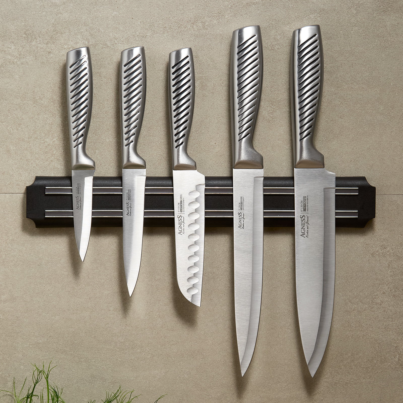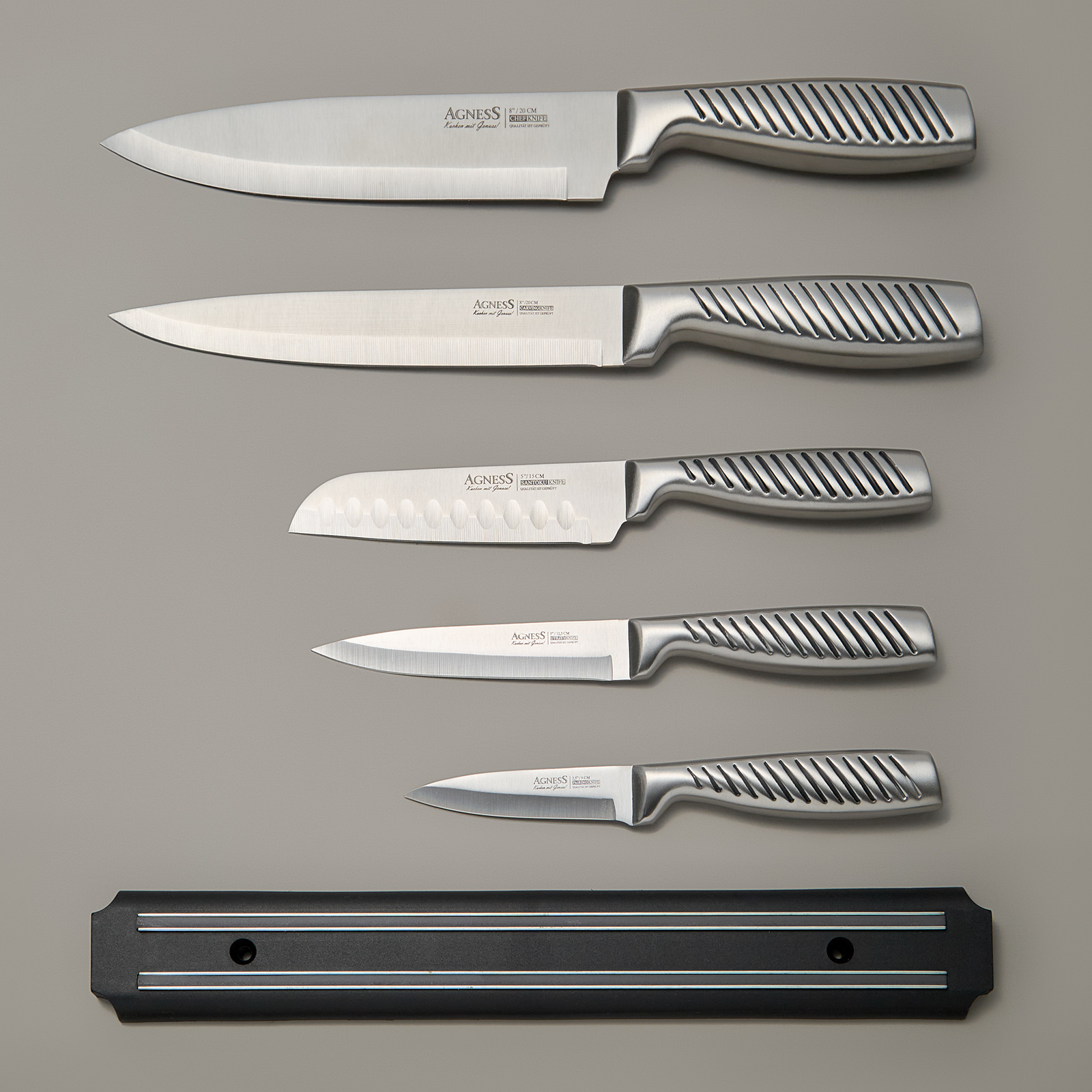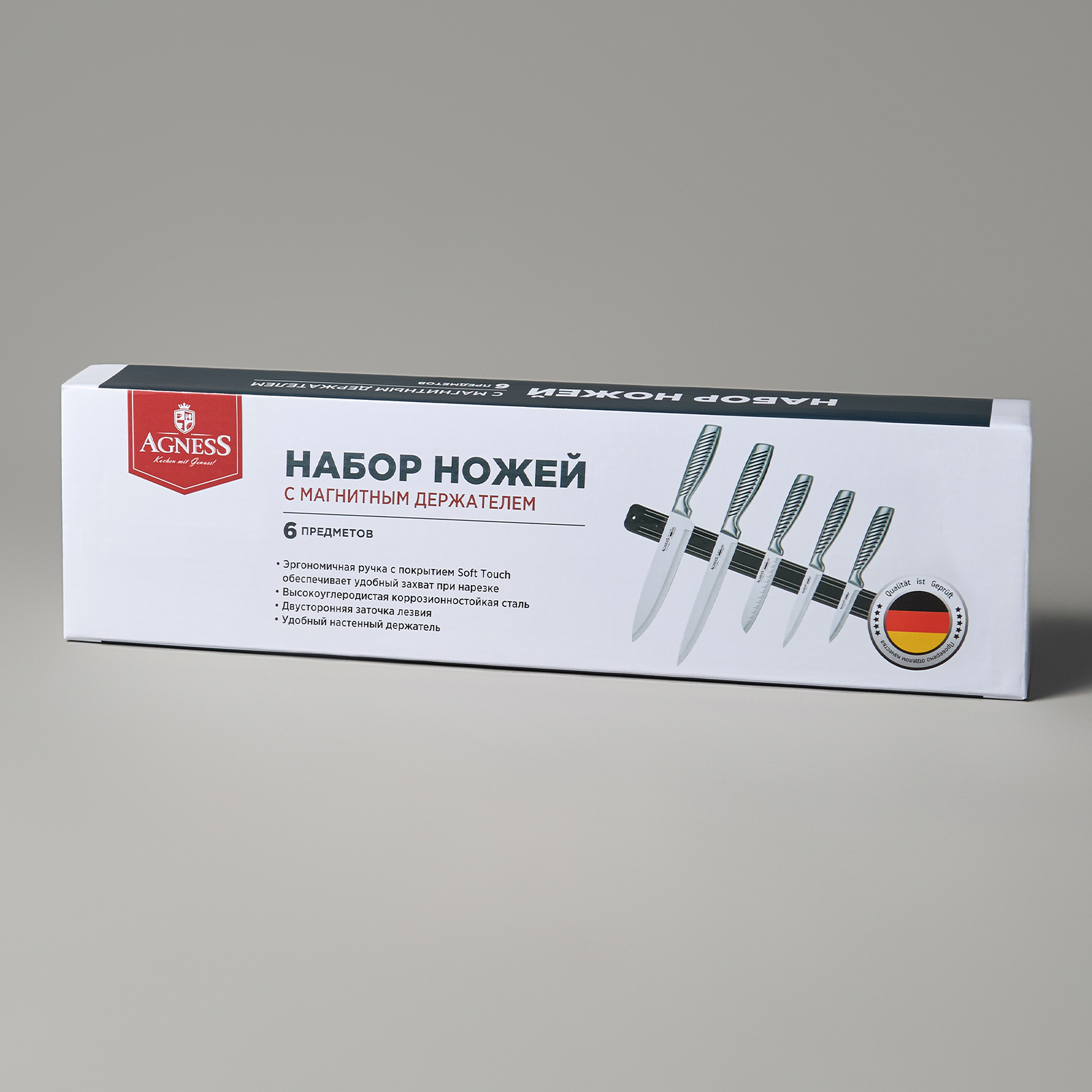 НАБОР НОЖЕЙ AGNESS 6 ПР.С МАГНИТНЫМ ДЕРЖАТЕЛЕМ И РУЧКОЙ ИЗ НЕРЖ.СТАЛИ