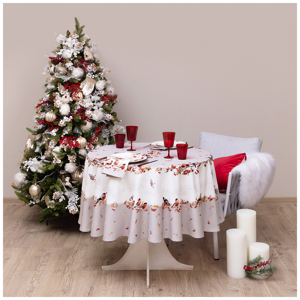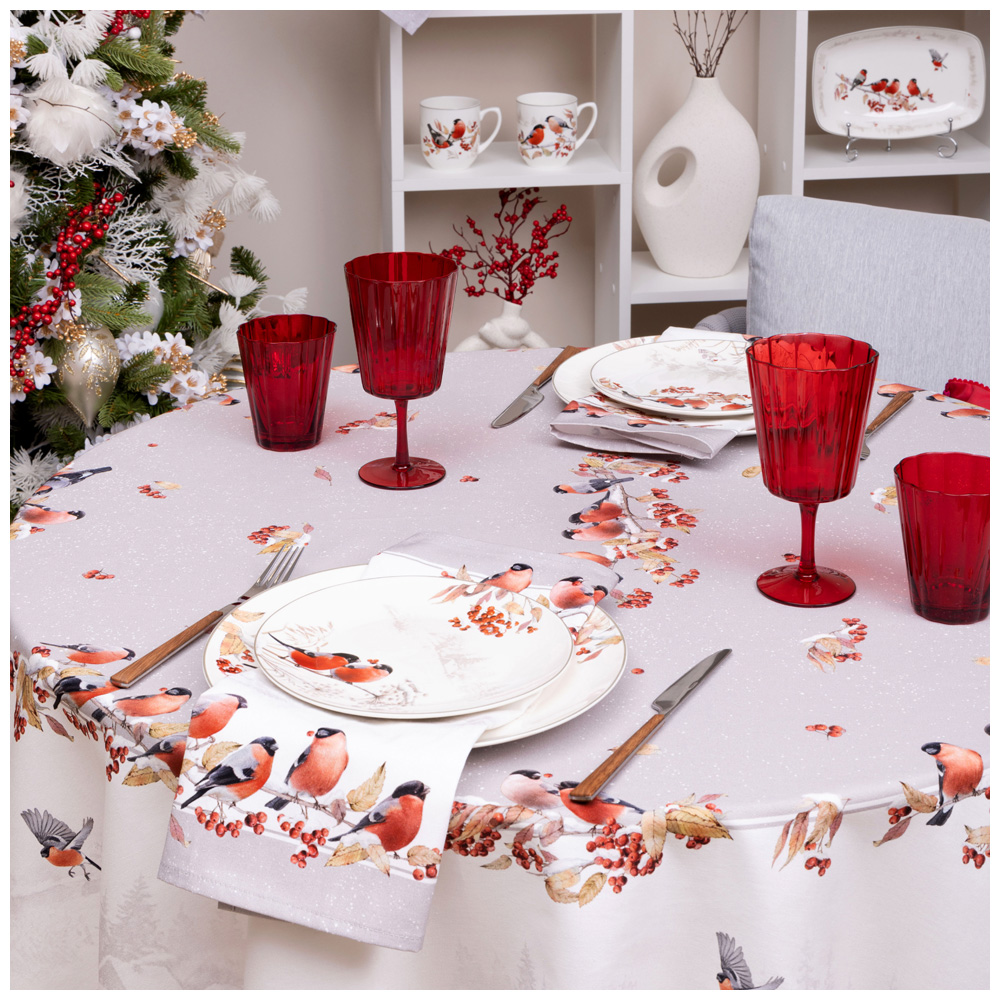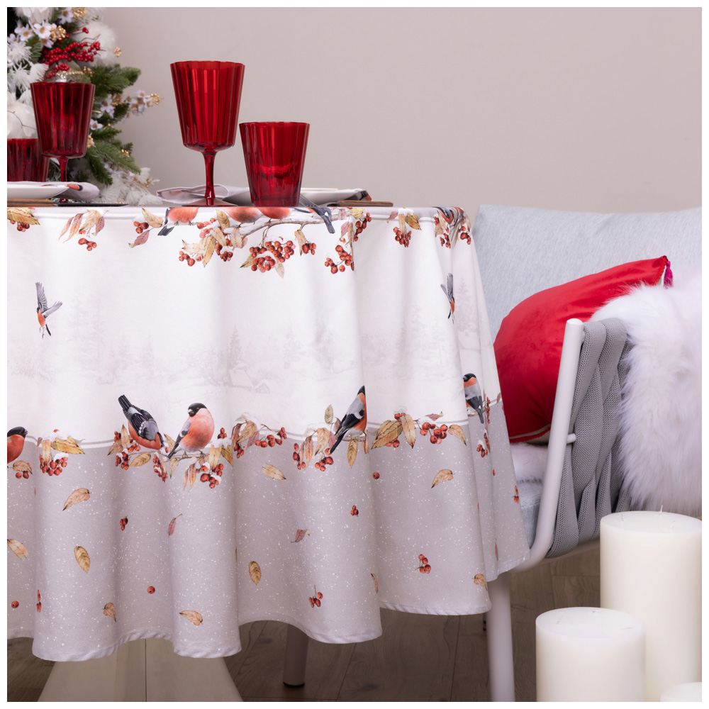 СКАТЕРТЬ КРУГЛАЯ "ЛЕСНАЯ СКАЗКА .СНЕГИРИ" 190СМ , СЕРЫЙ ,100% ХЛОПОК ,ТВИЛ С ПРОПИТКОЙ