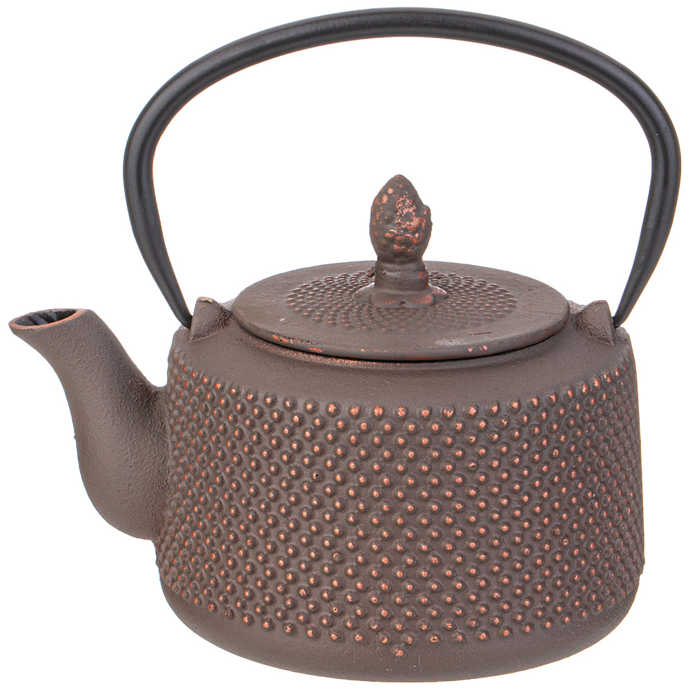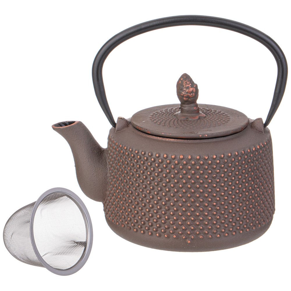 Устройте себе настоящую чайную церемонию с традиционным чугунным заварочным чайником. Внутренняя поверхность чайника покрыта эмалью, которая надежно защищает чайник от ржавчины и препятствует возникновению металлического привкуса у напитка, в связи с чем чайник идеально подойдет для заваривания Вашего любимого пуэра, улуна, черного, травяного или ароматизированного чая, раскрывая всю полноту вкуса напитка. В комплекте идет ситечко, которое надежно удерживает заварку. Не смотря на свои маленькие компактные размеры, этот чайник вмещает в себя 1000 мл, а его презентабельный внешний вид будет выигрышно смотреться на любом празднике.